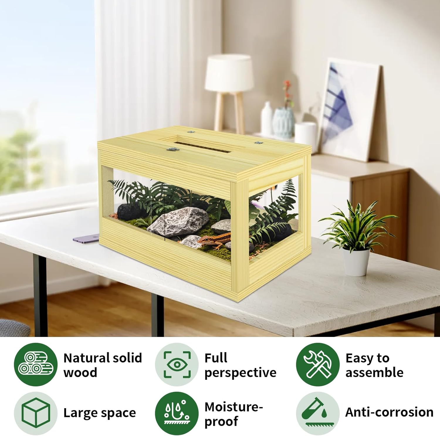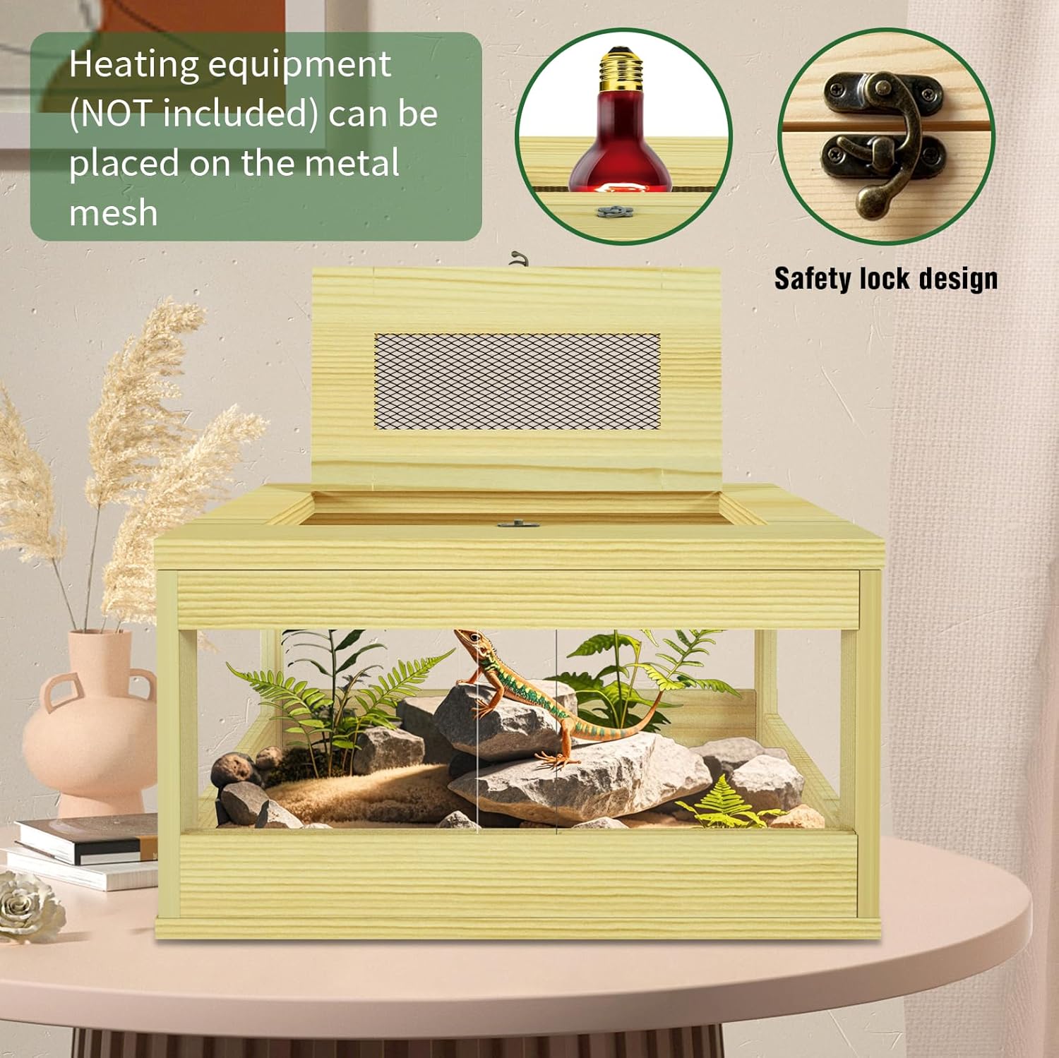Natural Solid Wood: Crafted from solid wood and clear acrylic, the FHNI reptile tank offers durability and elegance. The wooden lizard tank provides excellent insulation and soundproofing, ensuring a stable habitat for leopard geckos, bearded dragons, and snakes