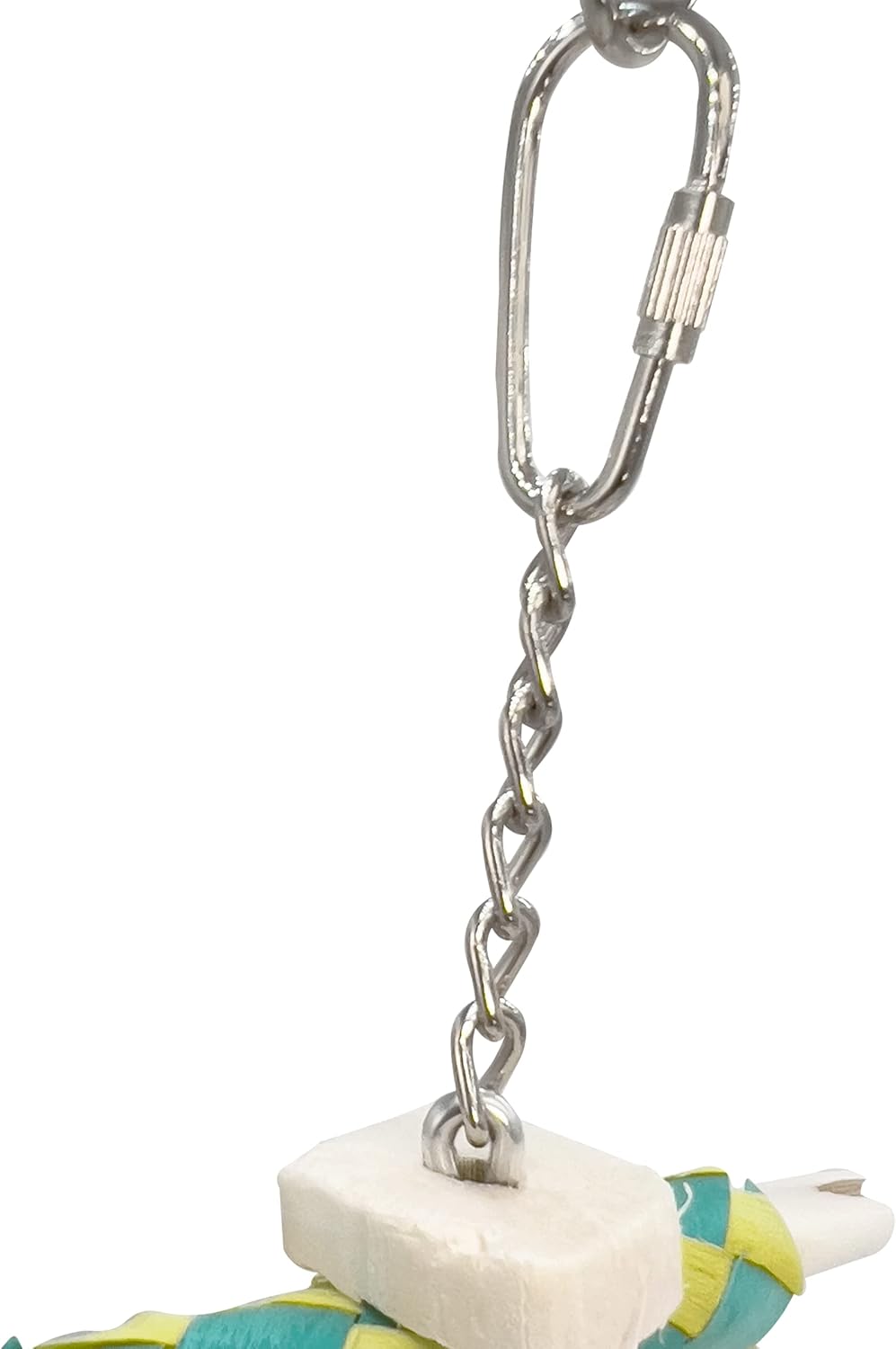 At the top of the 1115 Sola Stickler is a quick link connector. This classic toy link makes it easy to install the toy from a cage bar or similar structure. Hanging from the link is a length of sturdy link chain. This hangs to a tough metal wire that passes through the center of the body of the bird toy.