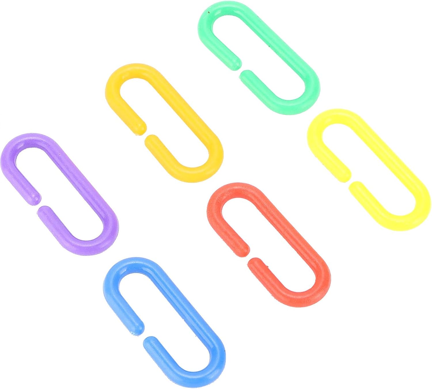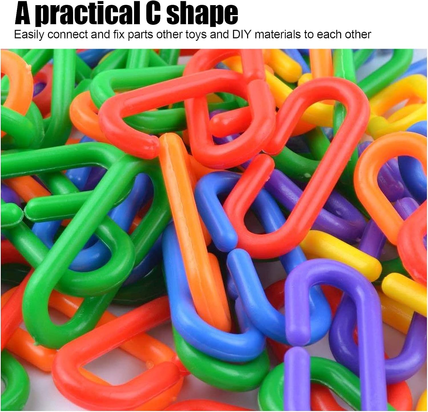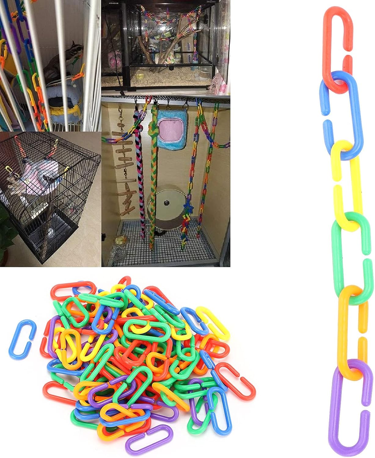 PRACTICAL PARROT TOYS: The plastic chain bird toy has colorful color design, so it can attract birds to play on it for a long time, you pet can chew, climb, and play with the diy toy plastic chain links to keep pets healthy.MULTI-PURPOSE: These c clips hooks chain links can be used for small pet cage climbing, educational toys, home decoration, but also can be made into heavy exaggerated necklaces, bracelets and earrings.EASY TO USE: Each link is made of a practical c shape, with a small opening for quick assembly, which easily connect and fix parts, other toys and diy materials to each other, the link can be assembled by yourself and connected into various shapes.PACKAGE: You will get approx 100pcs plastic hooks, mix of 6 bright colors, vibrant, and more attractive.They come in bulk and enjoy in diy, you can design the shape you want, and it can be perfectly hung on the top or side of the birdcage.MATERIAL: The plastic chain link is made of plastic, they are easy to use, wipe clean and you can use them again, the chain links are lightweight and hang perfectly from the top or sides of your bird cage.