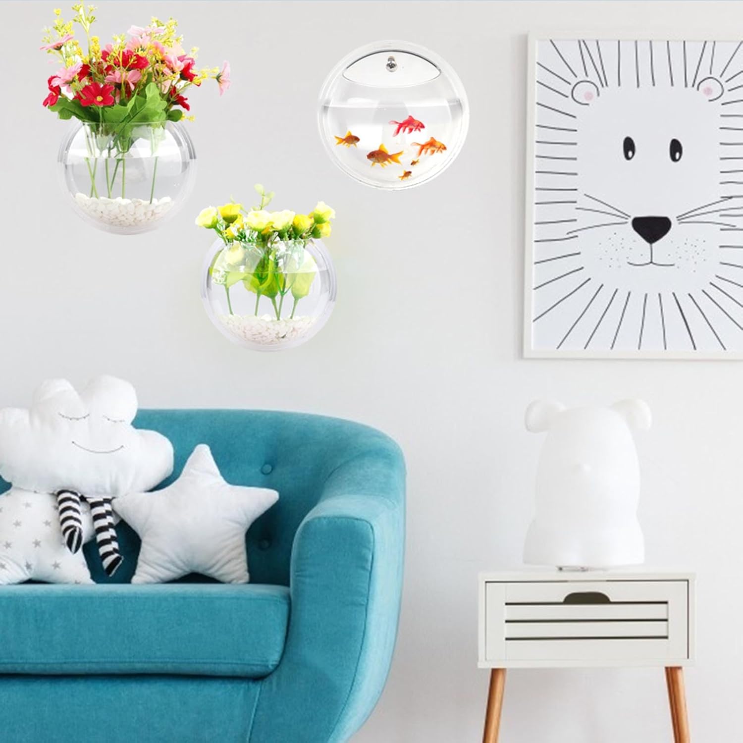 Size and Materials: Diameter of approx 6″ for each fish bowl; Made of Acrylic, treats it carefully when installed. Suggested to install the nail hook with hammer