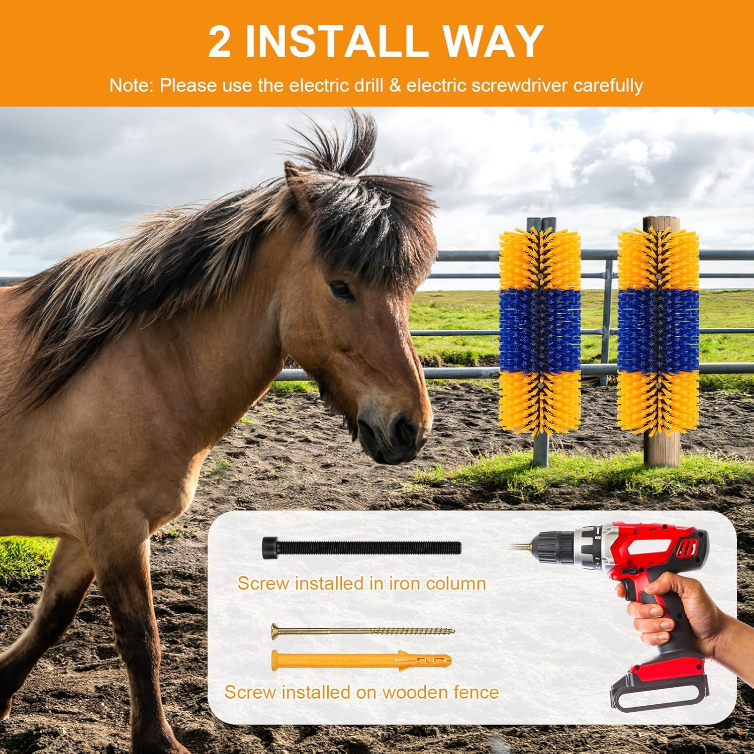 Friendly for Animal: Livestock Scratch Brush makes it easy for your livestock to groom, keep clean, relieve itching, shed and more. We added 4 screws and tightening bolts to help hold the brush securely where you want it, whether it’s a tree trunk or an iron railing.