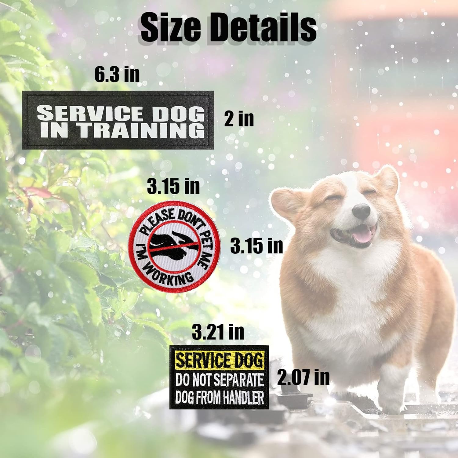 3 Pcs letter dog patches: 2 Pcs “SERVICE DOG IN TRAINING” and 1 Pcs “SERVICE DOG DO NOT SEPARATE DOG FROM HANDLER”.1 Pcs pattern embroidery dog patches: 1 Pcs “PLEASE DON’T PET ME I’M WORKING”.