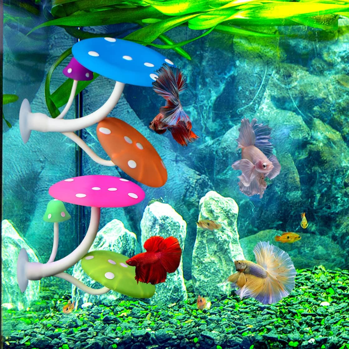 Betta fish tank accessories:Package includes 3 betta leaf beds and 2 different colored mushroom betta resting spot. Can add more bright and beautiful colors to your fish tank.