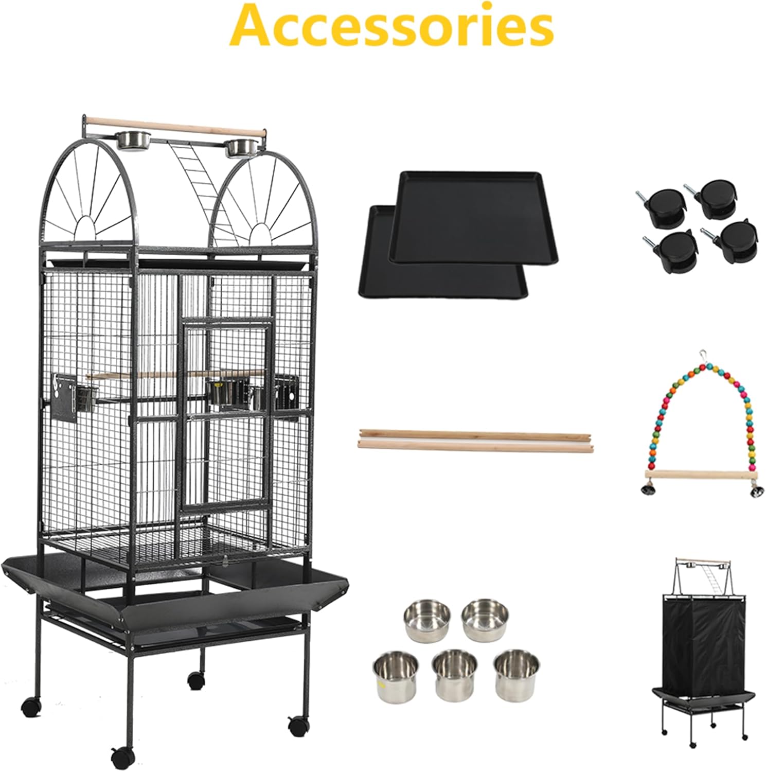 Give your feathered friend a spacious and comfortable home with this premium 69-inch tall wrought iron flight cage. Perfect for a variety of medium to large birds, this cage features a roomy interior with multiple perches and feeding stations. The thoughtfully designed play top provides additional entertainment space, while the rolling stand with lockable wheels makes mobility effortless. The cage includes essential accessories: feeding bowls, wooden perches, a colorful swing, and a night cover for peaceful rest. The sturdy construction includes a bottom tray for easy cleaning, and the 0.69-inch bar spacing ensures safety. With dimensions of 31.6″ x 29.8″ base and 32″ height (48″ total height with stand), this cage provides ample space for your bird to spread its wings. The arched top design adds elegance while maximizing vertical space, making it an ideal home for cockatiels, parakeets, African Grey parrots, and many other species. The black finish offers durability and complements any room decor.