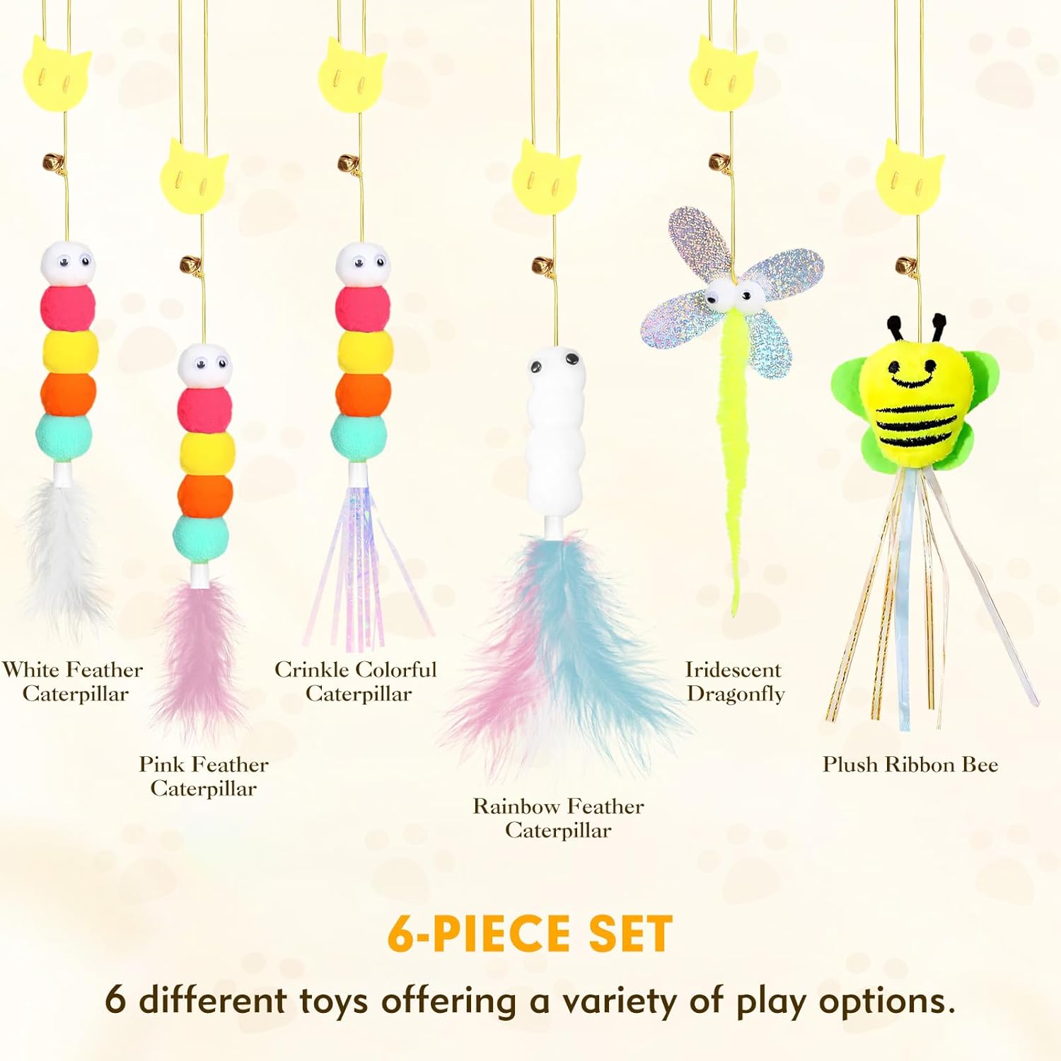 Enrich Your Cat’s Playtime with 6 Unique Toys:This set includes 6 different interactive hanging cat toys,each designed to engage your indoor cats,kittens,or bored adult cats.Featuring colorful designs,feathers,and built-in bells,they stimulate natural hunting instincts and keep your cat entertained.