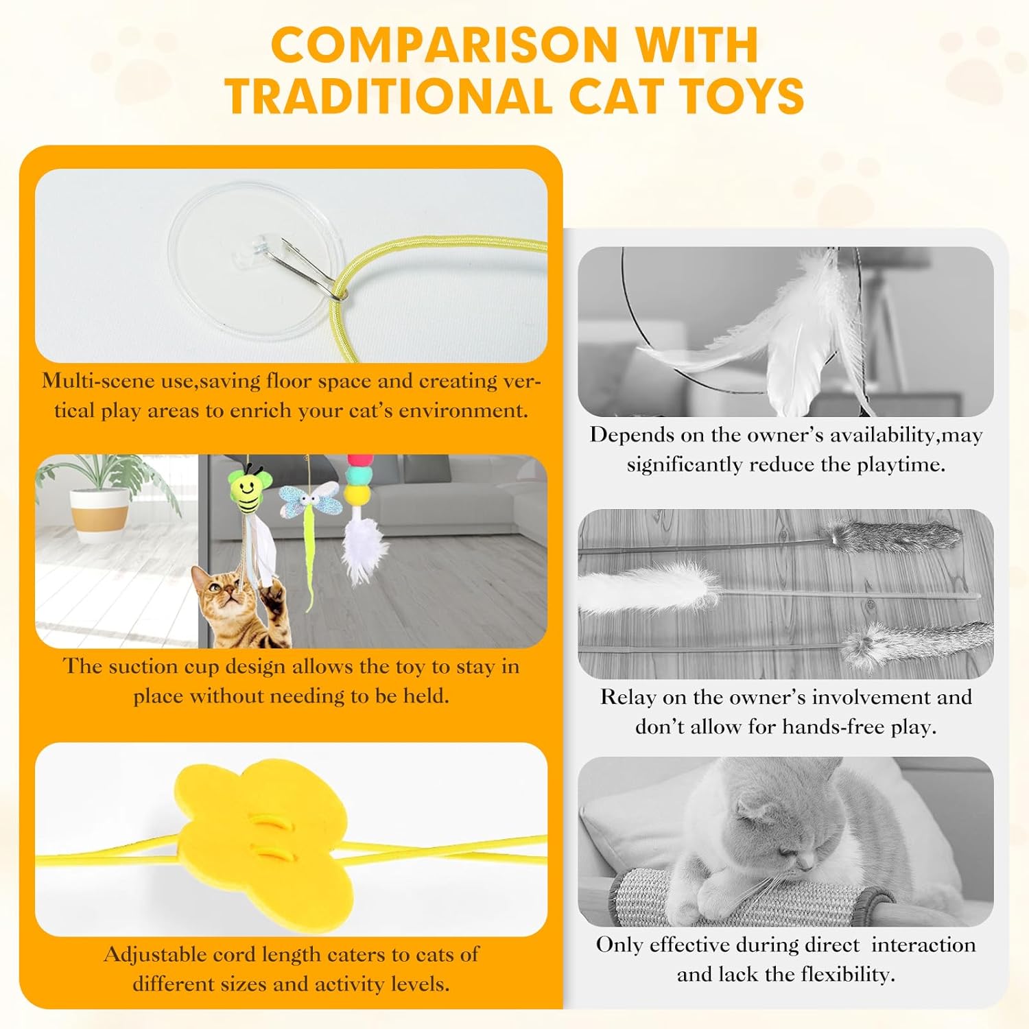 Hands-Free Play with Adjustable Strings:Designed with a sturdy suction cup that can be easily attacthed to any smooth surface,like a door frame,glass window,ceiling and walls or cat tree.The adjustable string length lets you customize the height offering your cat hours of self-play without needing your hands.