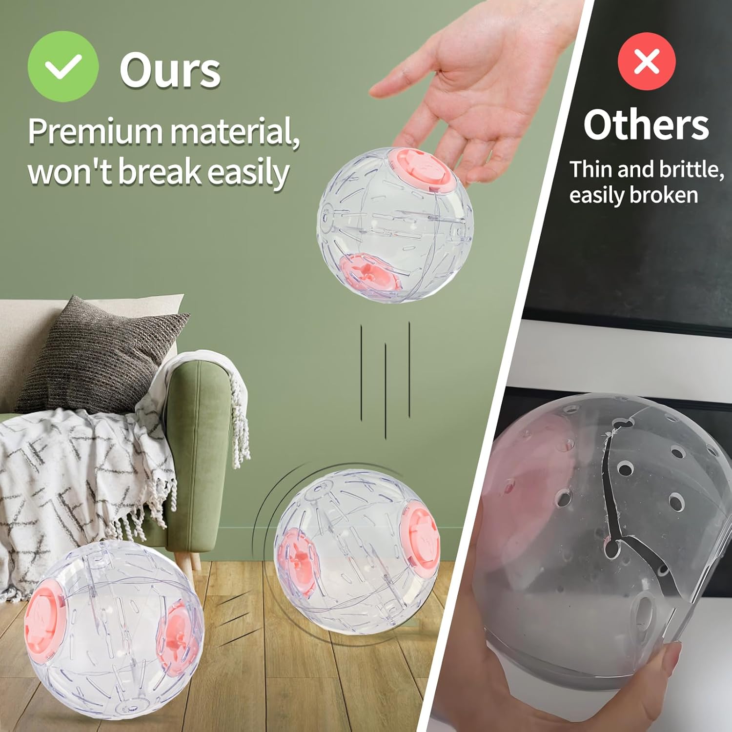 【Ventilation & Grip Design】The ball features elongated holes that serve as both breathing vents to ensure hamsters can breathe smoothly while running, and as grip holes to help hamsters maintain stability inside the ball, reducing the risk of falls and injuries.