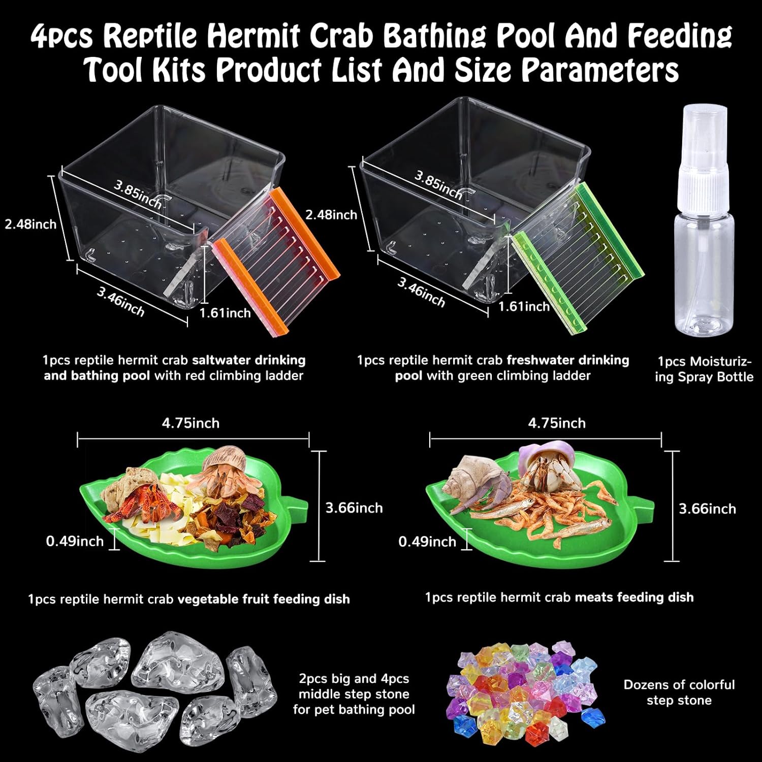 【7 packs reptile hermit crab bathing drinking and feeding products list】1pcs transparent hermit crab bathing pool with red climbing ladder, 1pcs transparent hermit crab freshwater drinking water pool with green climbing ladder,1pcs green leaf shape vegetable fruit feeding dish, 1pcs green leaf shape meat feeding dish,dozens of colorful decorative stones, a fews of big transparent step stone and 1pcs humidifying water spray bottle