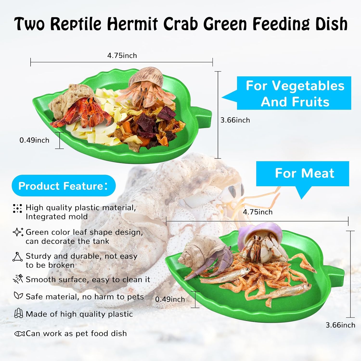【Safe, sturdy and durable material】The two high quality transparent water tank with ramp is made of high quality plastic material. The two green leaf are made of high qualit plastic product.Both type hermit crab product are made of safe, durable and unbreakable material,which will never be rust,never be harm for the reptile pet and is very easy to be clean