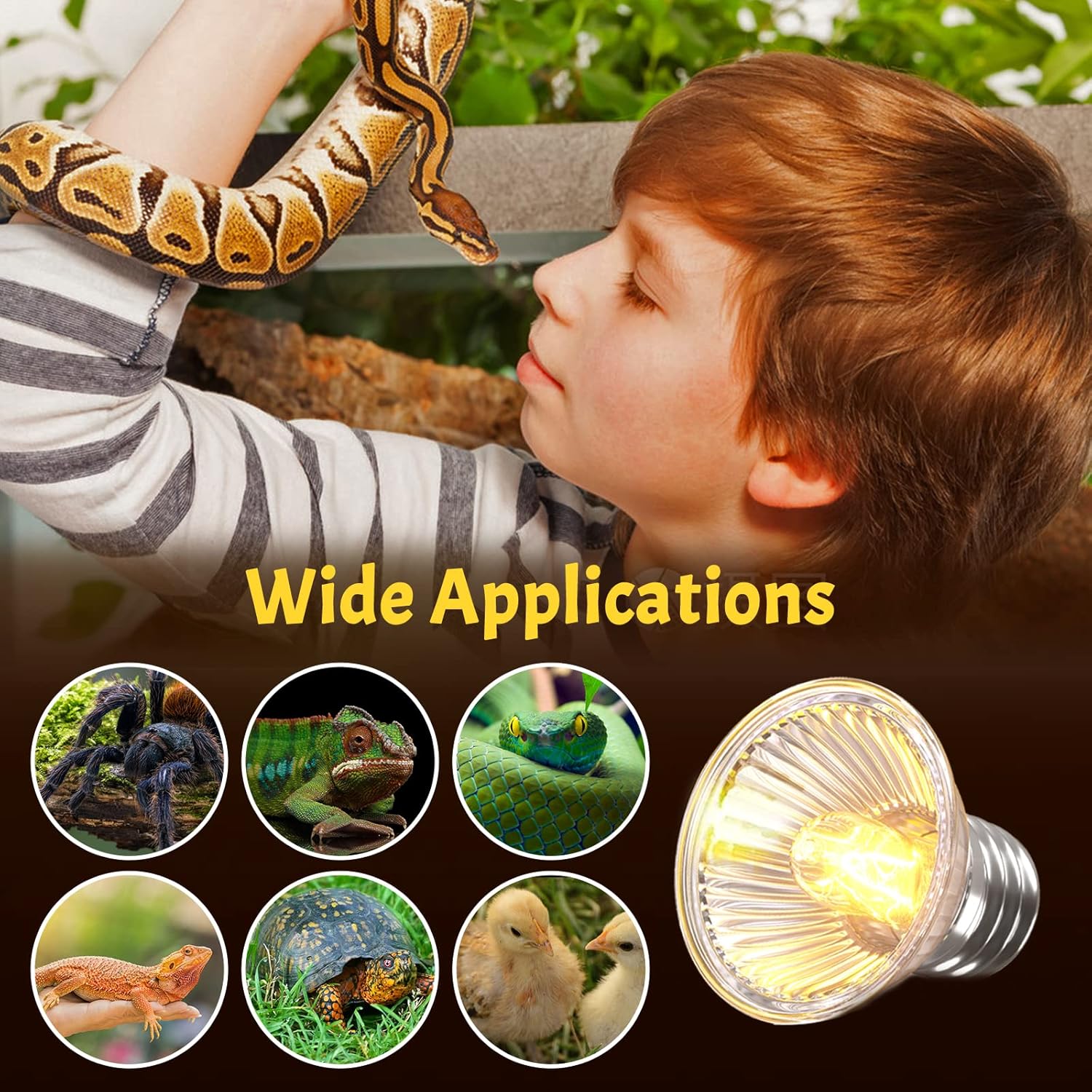 【Dimmable Warm White Light】 Lustaled 50w turtle basking light bulb is dimmable, allowing you to adjust the temperature output by dimming the bulb’s wattage. This feature provides a more comfortable and stress-free environment for your pets, ultimately contributing to better health and overall well-being.