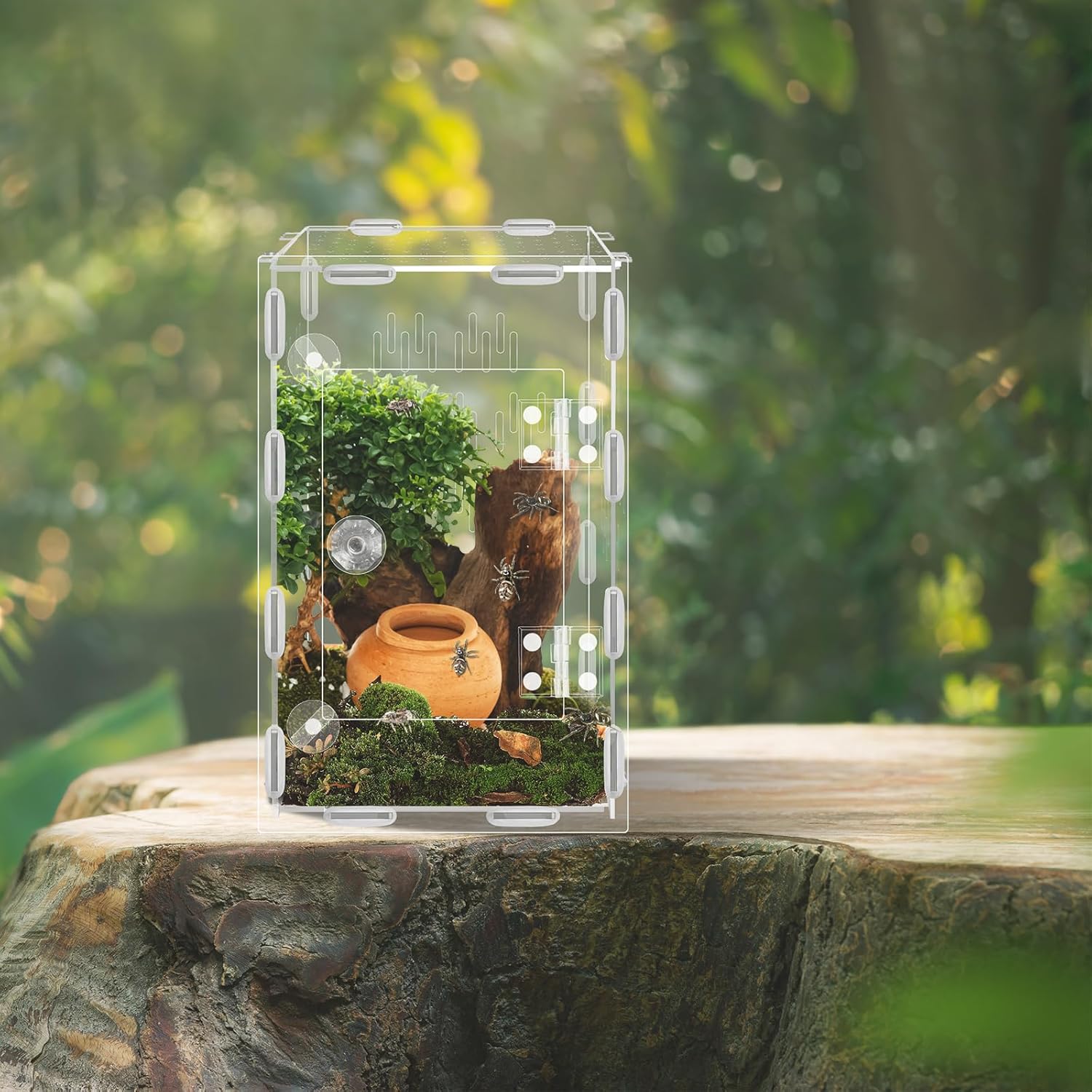 Say goodbye to complicated setups and hello to seamless convenience. Our jumping spider enclosure arrives fully equipped with all necessary accessories and rubber seals, ensuring a hassle-free assembly process. Simply snap the components together and secure them with the provided rubber rings for a secure, escape-proof fit. This insect terrarium not only keeps your pet safely contained but also makes for an elegant addition to any space.
