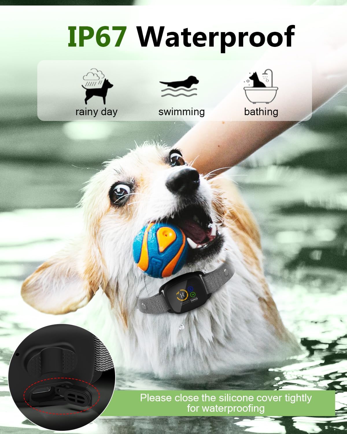 Rechargeable Bark Collar for Small Dogs — Waterproof and Long Battery Life: This IP67 waterproof bark collar for small dogs, making it ideal for rainy weather, bath time, and swimming. The long-lasting battery supports up to 10 days on a full charge. The USB-C charging port stays securely connected without slipping.This rechargeable bark collar ideal for outdoor training and daily walks.