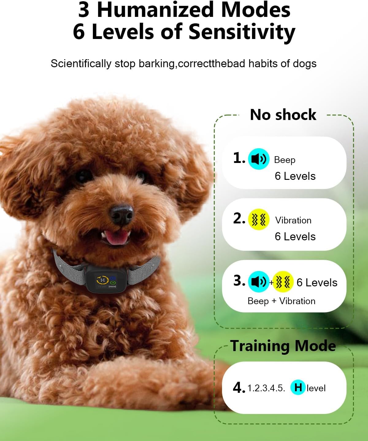 No Shock Bark Collar for Small Dogs — Humane & Adjustable Training Modes: This training collar for dogs provides safe correction through 3 gentle modes: Vibration, Deep, and Deep+Vibration & 6 adjustable sensitivity levels, it ensures effective training without harm. This anti barking collar is ideal for small dogs 5-15lbs and medium dogs. Note: Low battery may affect sensitivity, keep it fully charged for optimal performance.