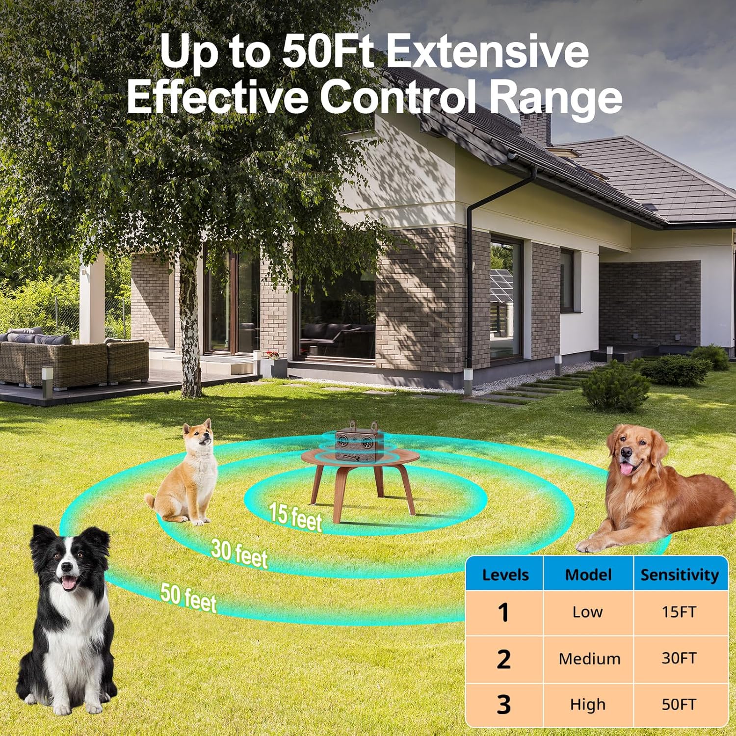 【3 Adjustable Modes and Range】There are 3 adjustment modes, 1 low range up to 15 feet, 2 medium range-up to 30feet, 3 high range-up to 50feet,the Ultrasonic Dog Barking Control Device can be fine-tuned to detect barking from a range of distances, making it effective for dogs of all sizes. Whether indoors or outdoors.