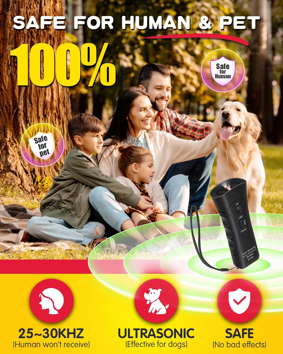 SAFE FOR DOGS & HUMANS – The most humane and used widely way to keep your dog or your neighbor’s dog from barking. The ultrasound of the anti barking device will not cause interference or harm to humans, because humans can not hear these frequency bands, but dogs will be sensitive to these ultrasounds