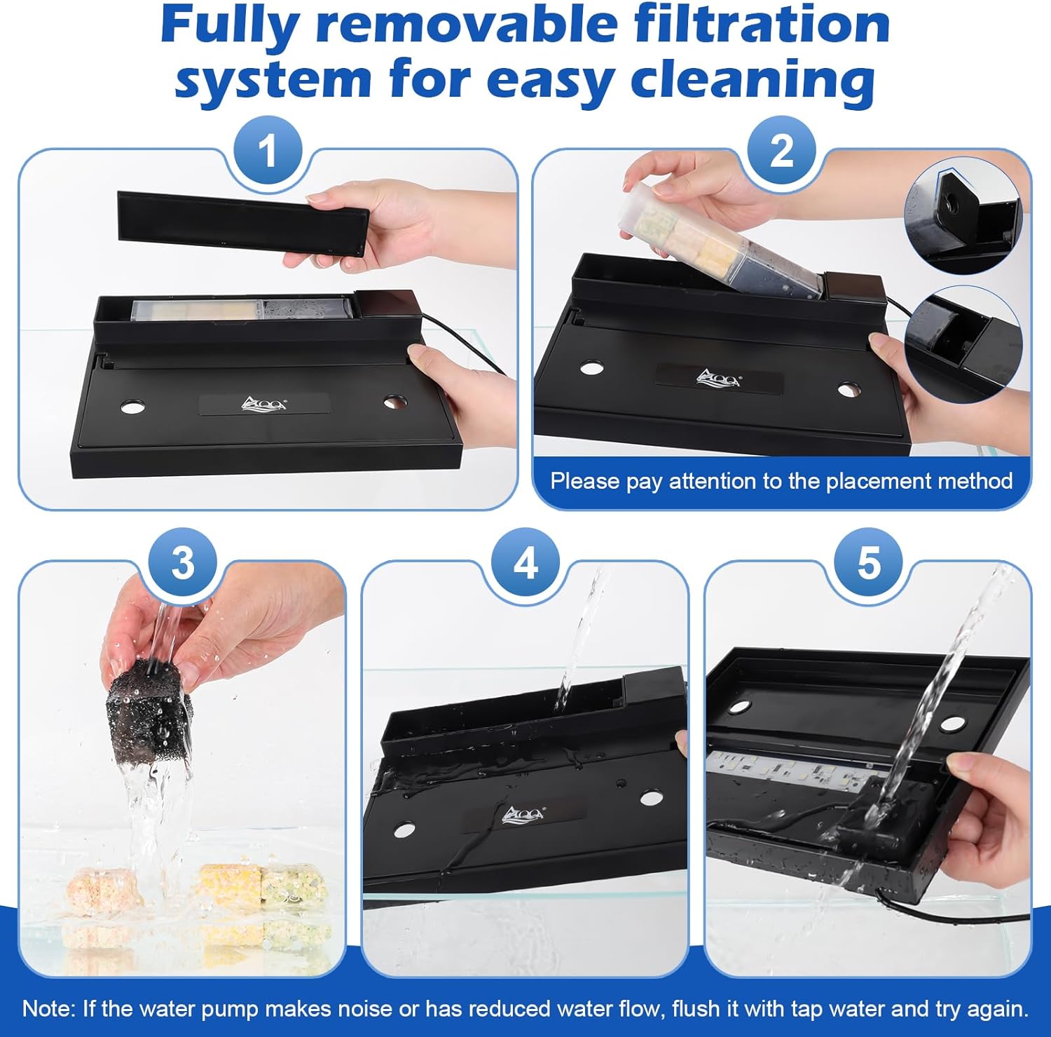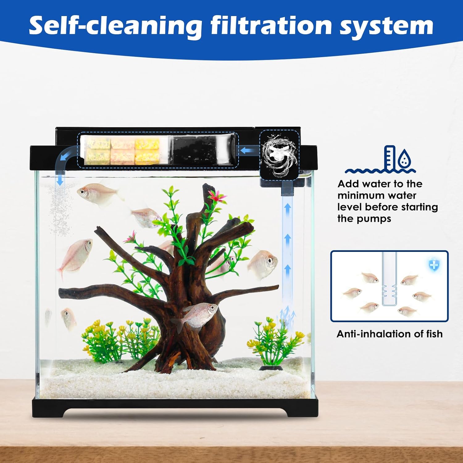 Easy to Clean & Feed – Built for Busy Lifestyles: The ABS cover detaches completely for full access to the glass tank, while the built-in feeding hole prevents spills and stress. Smooth glass edges and a visible minimum water level line ensure effortless maintenance and optimal filtration performance.
