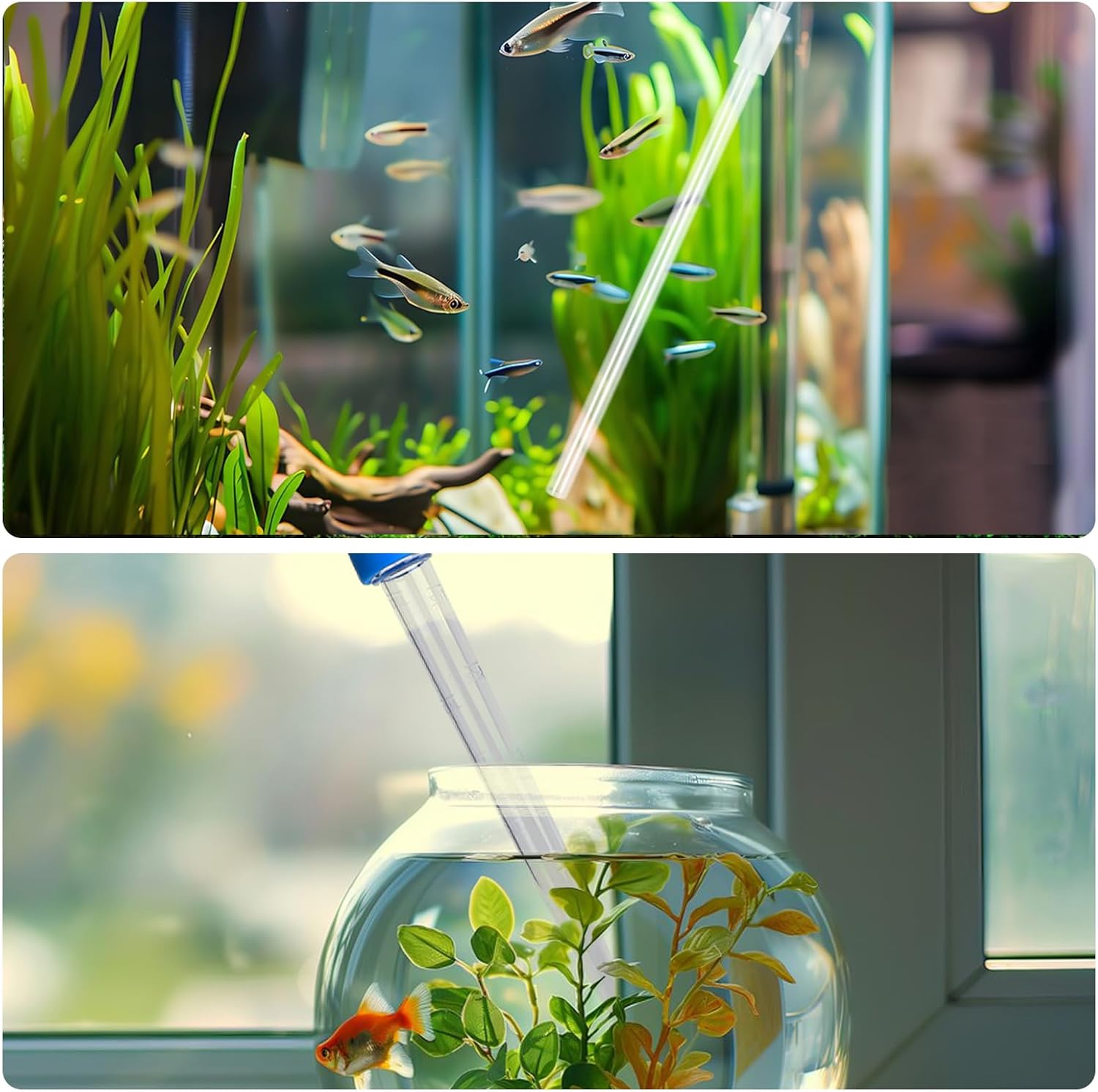 Extended flexible straw with non-slip handle for easy access to fish tank corners; The transparent tube can observe the cleaning progress in real time, accurately control the suction, and avoid the accidental suction of fish, shrimp or water grass.