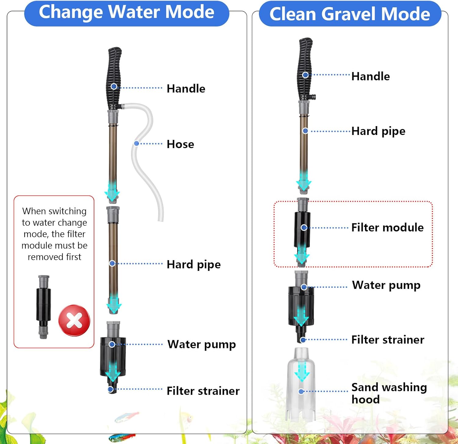 Easy to Disassemble and Clean: The water pump and filtering device of the water changer are designed to be detachable. You can easily disassemble and assemble them without using tools. Meanwhile, the disassembled rotor and sponge are extremely convenient to clean. Attention: whenever you uses the sand washing function, it must be cleaned. and regular cleaning can prolong its service life