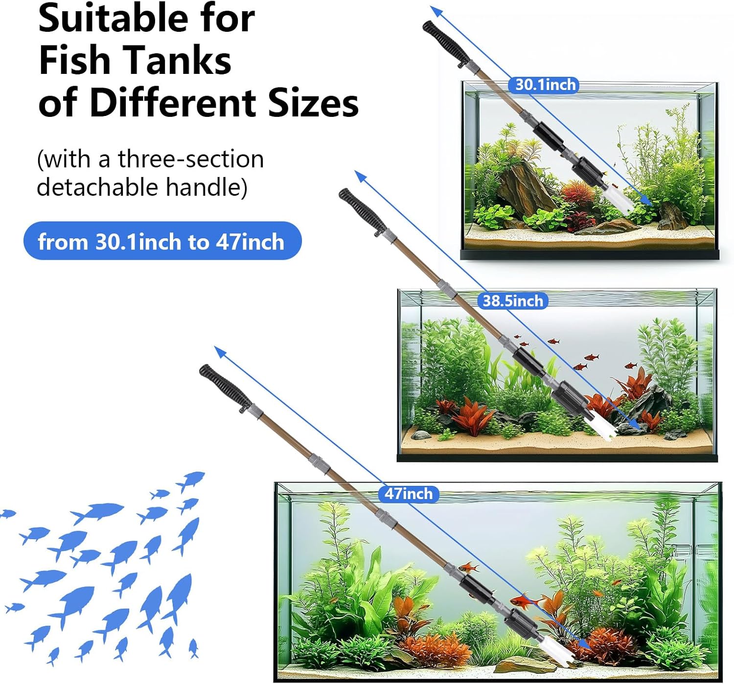 Detachable Hard Pipes for Various Tank Sizes: Our fish tank gravel cleaner comes with 3 detachable hard pipes. The length of a single hard pipe is 9.09 inches, and the adjustable size range of the water changer is 30.1-47 inches. You can install the appropriate number of hard pipe sections according to the size of the fish tank