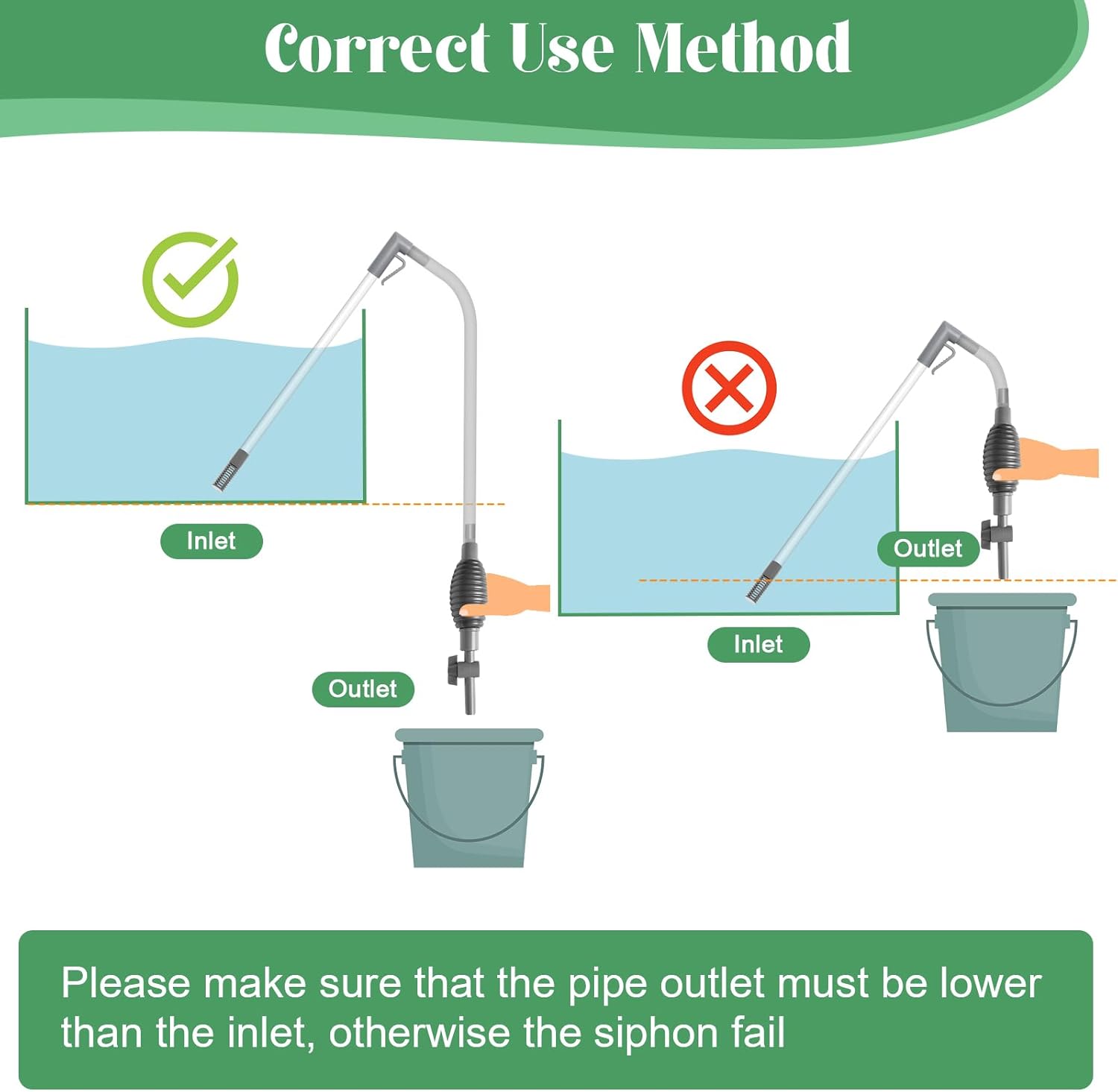 【Easy to Use】Just connect the rigid tube separately to the filter suction head and hose; then connect the other end of the hose to siphon ball, fix the clamp to the hose on the aquarium, the intake end is immersed in water, then siphon, you can easily complete the install and start cleaning. Note: The hose can be softened by soaking it in hot water for a few seconds for easier connection