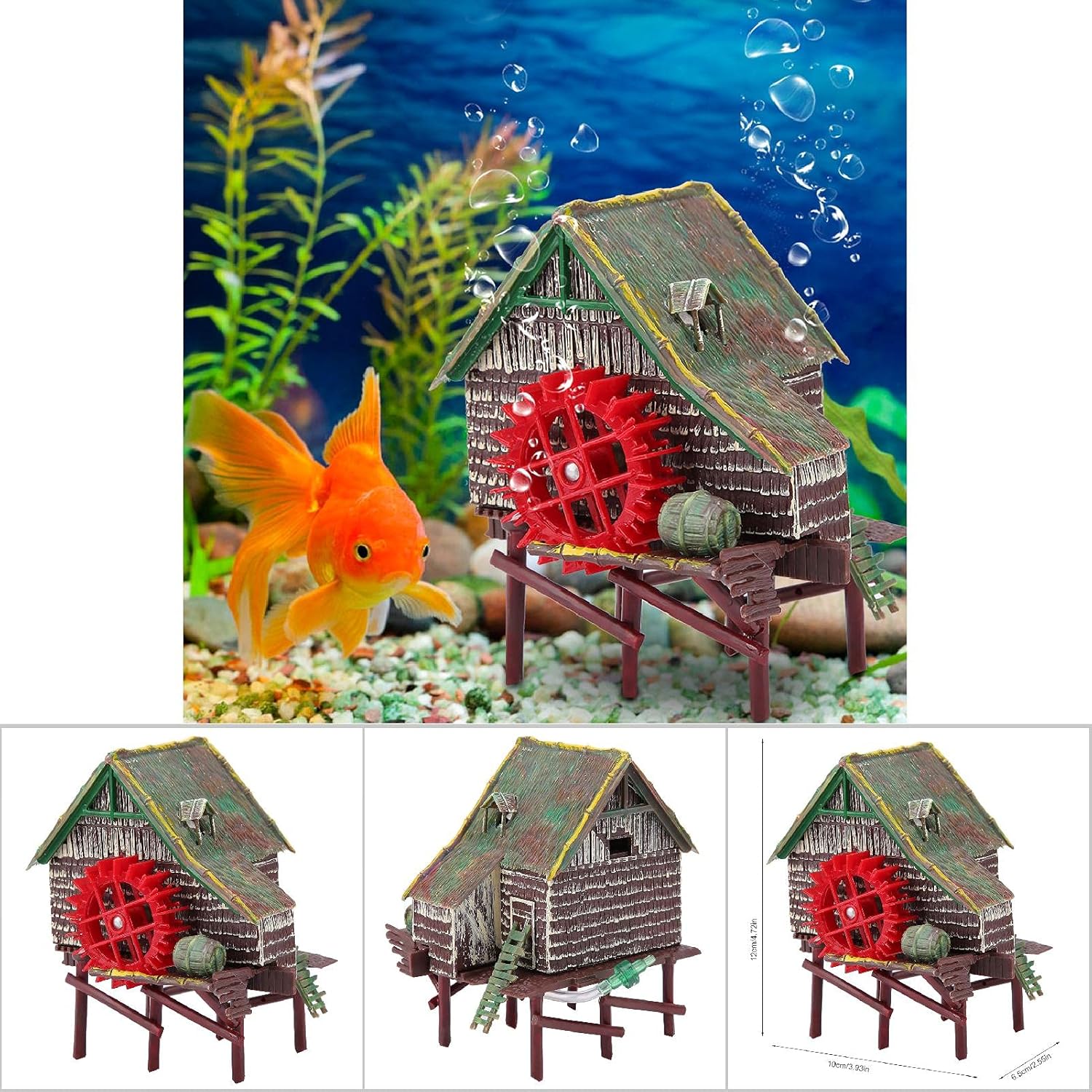 [Natural and Realistic Appearance]: Fish tank villiage water wheel is vivid and color detailed to add lively and natural life to your tank; Fish tank waterwheel is great to decorate your aquarium all the time with minimum responsibility and maintenance