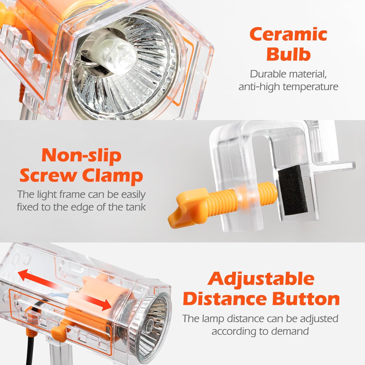 【ADJUSTABLE DISTANCE】This basking light can adjust the distance of the bulb according to the temperature and brightness you need. There are buckles on both sides of the lamp holder to fix the bulb, and it is marked for you in three ranges of MIN, MEDIAN, and MAX, which is very convenient to use. The screw clip supports up to 3.5cm/1.38″ and is very stable and easy to install, you can clip it onto a tank or desk