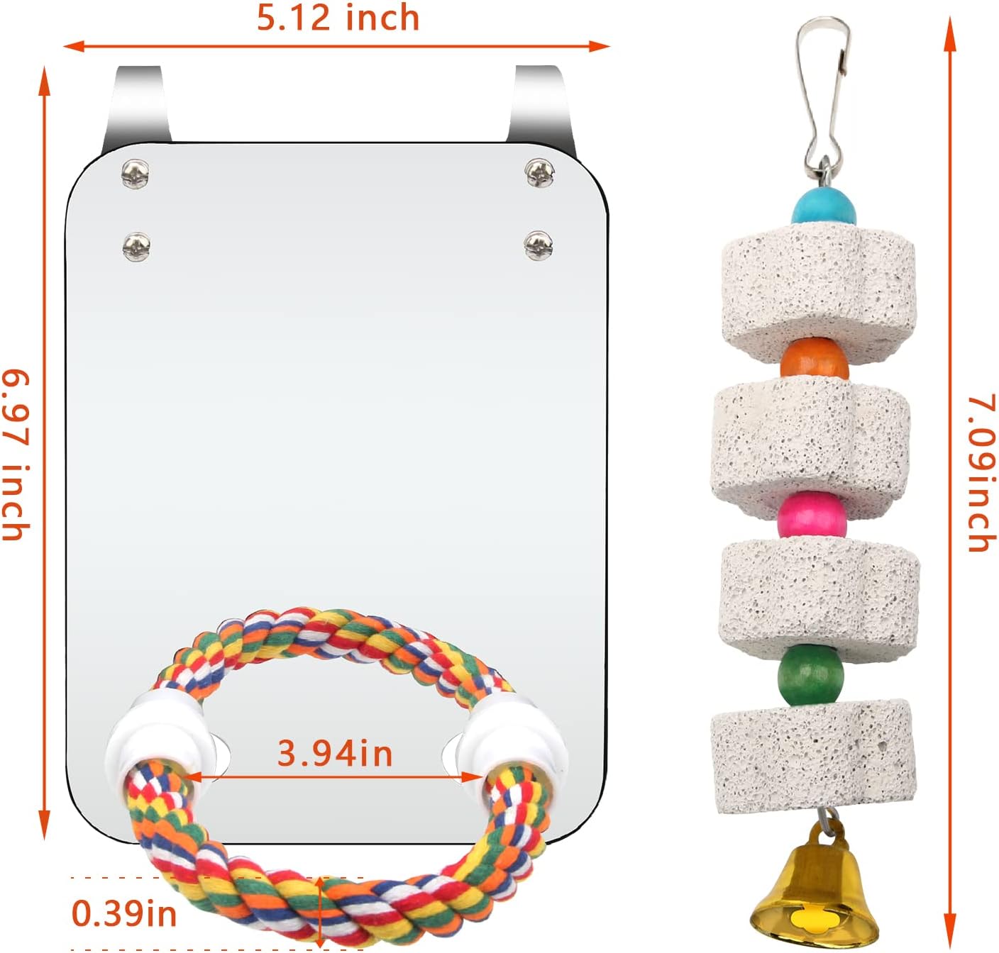 🐦【Packing Listing】The package includes a parakeet mirror with a perching cotton rope and a string of parrot molars, mirror size:6.97×5.12in/17.7x13cm, colored rope:6.7in(L), 0.39in thick, grinding stone length: 7.09in/18cm, suitable for most types of bird cages.