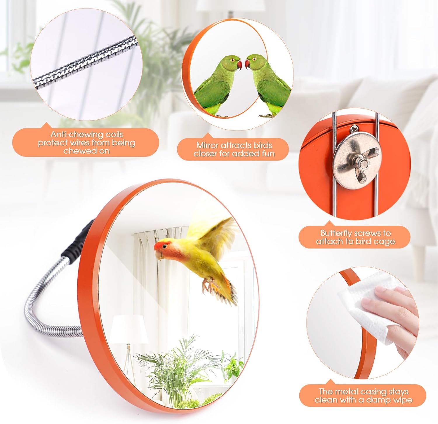 Thoughtful details: the mirror can attract birds to come close and add fun to your little bird; stainless steel anti-nibbling coil protects the wire from being nibbled; butterfly screws can be fixed to the bird cage; the metal housing can be kept clean by wiping it with a damp towel