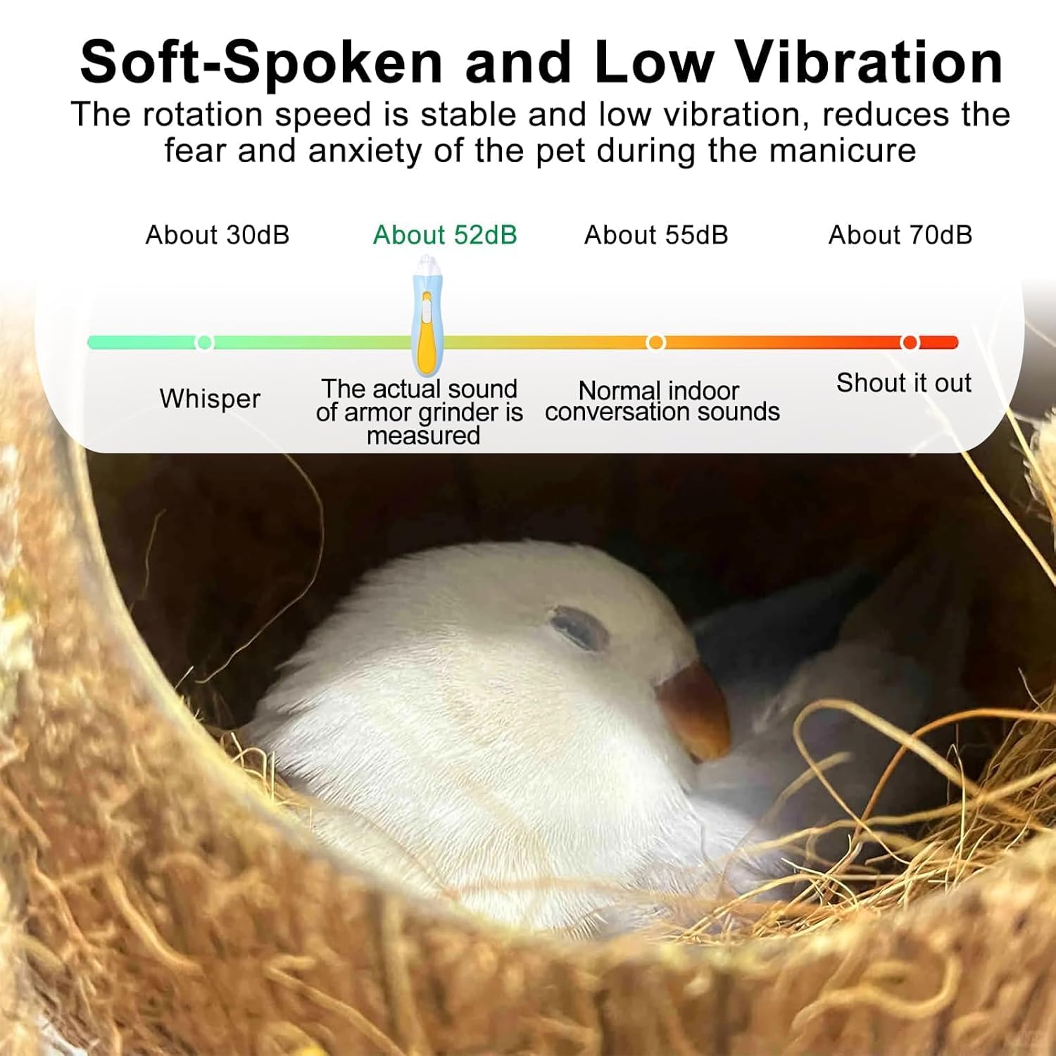 Low-vibration bass:Electric parakeet beak grinding stone uses a gentle bass motor that runs at a steady, low-vibration speed and passes quietly with minimal vibration, these excellent features help to reduce the pet’s fear and anxiety during the manicure process, making them more relaxed and at ease during the manicure process.