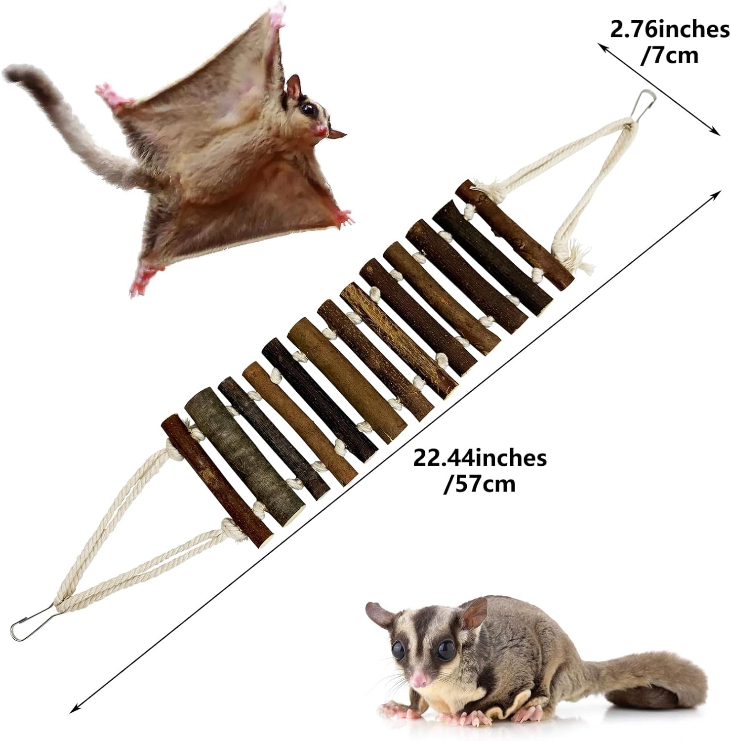 Size of Wooden Ladder: Sugar glider stand, handmade with hardwood sticks and soft ropes (10.63”L x 2.76”W). Bendable design transforms into a climbing ladder, bridge, or resting platform for play and relaxation in habitats