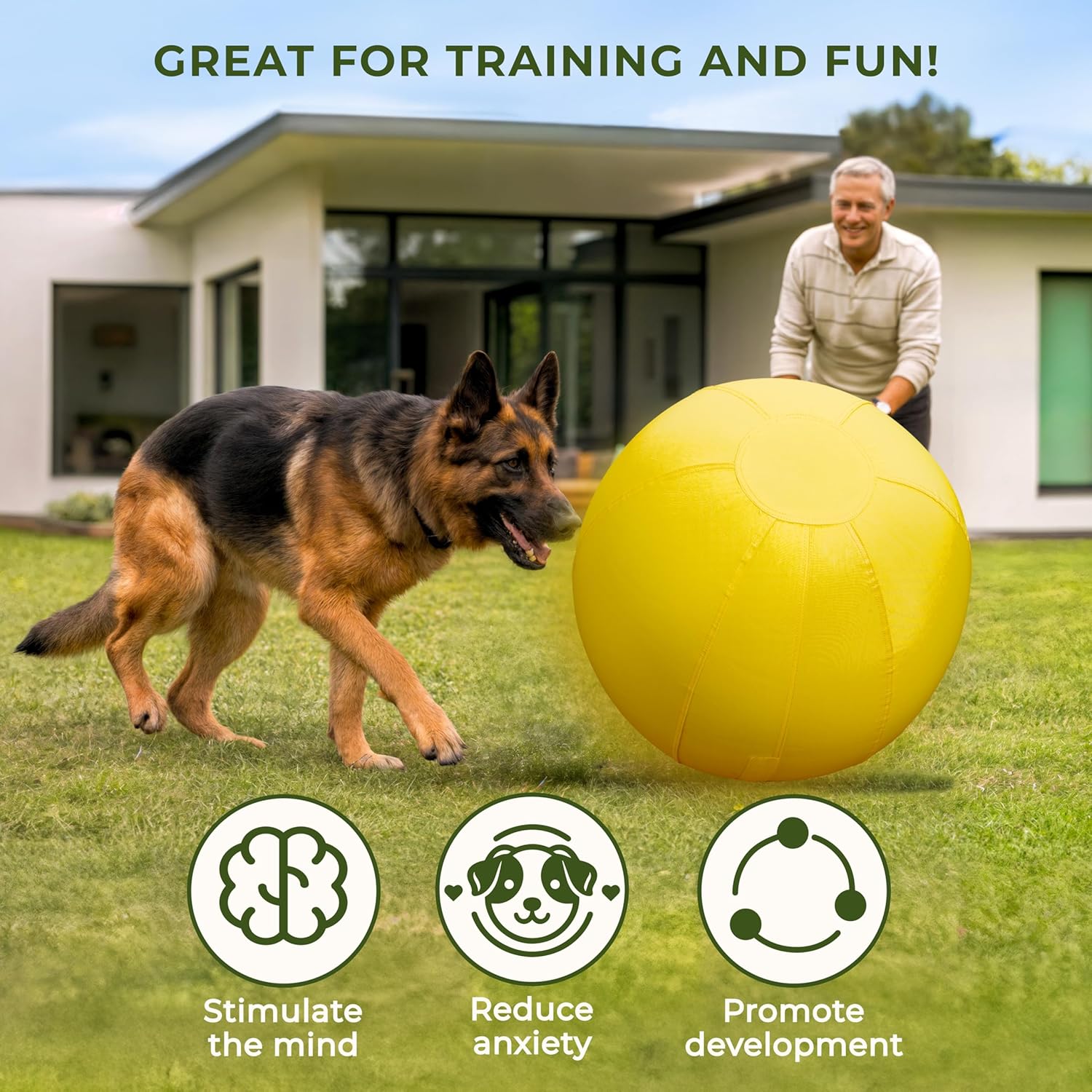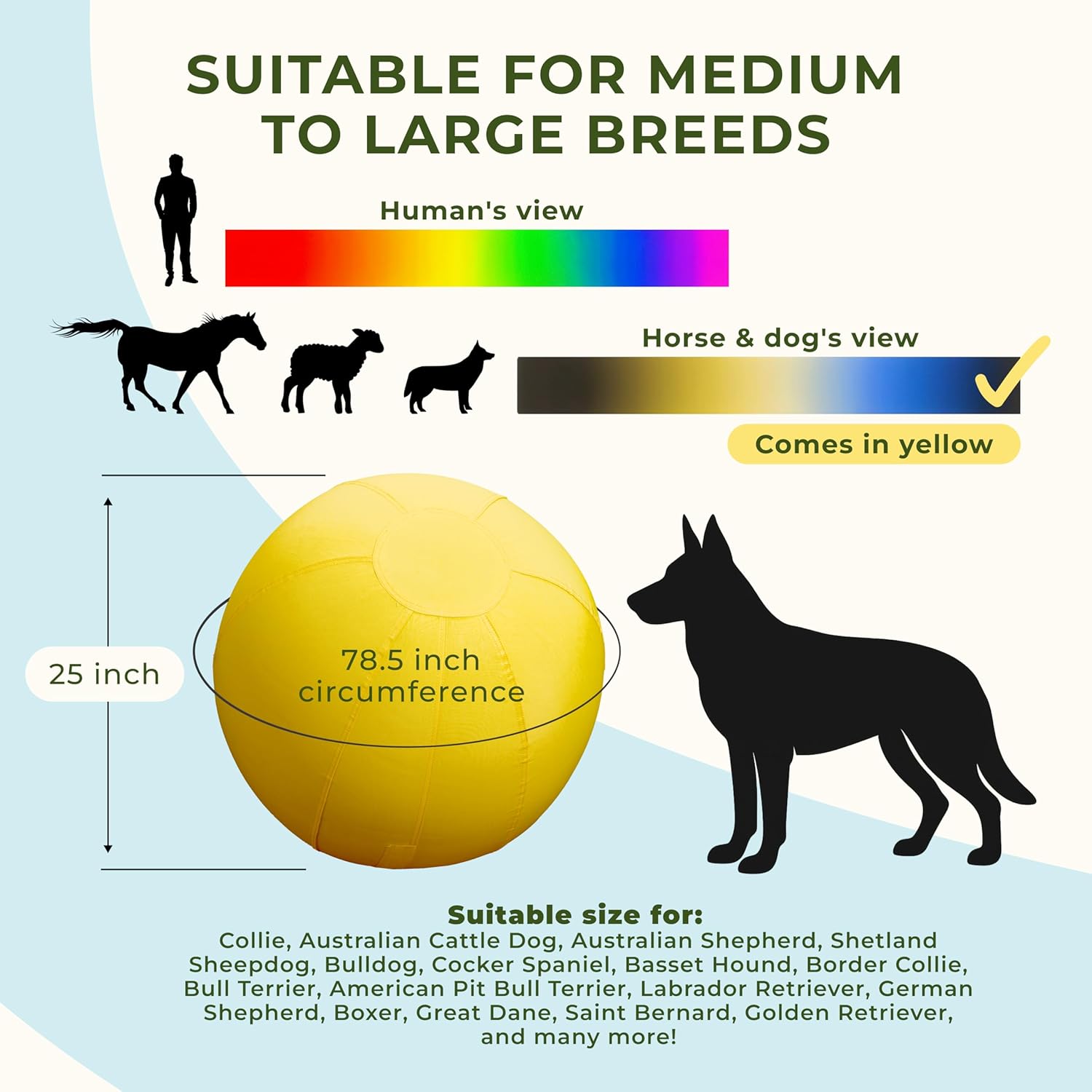 Engaging Herding Ball for Dogs: Let your active pup unleash their inner herder with our herding ball for dogs! Suitable for Australian Shepherds and other high-energy breeds, this dog toy ball keeps it engaged as they chase and push it across open fields. With its impressive 25-inch diameter; this giant dog ball is tailor-made for medium to large breeds like Border Collie, Australian Shepherd, Cattle Dog, Labradors, German Shepherds, and Golden Retrievers and many more