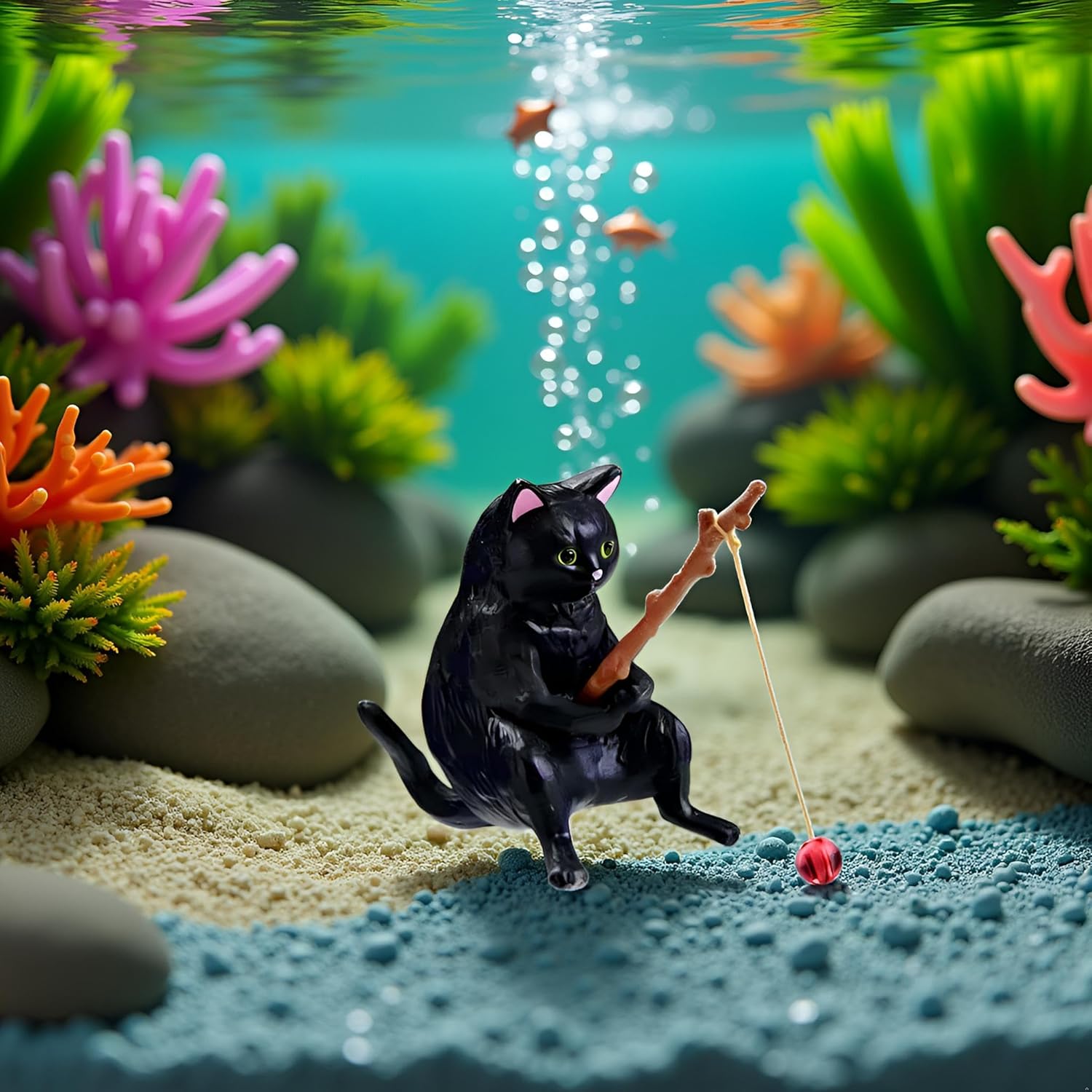 DECORATIVE DESIGN: Black fishing cat figurine adds a whimsical and playful touch to any aquarium or fish tank setting