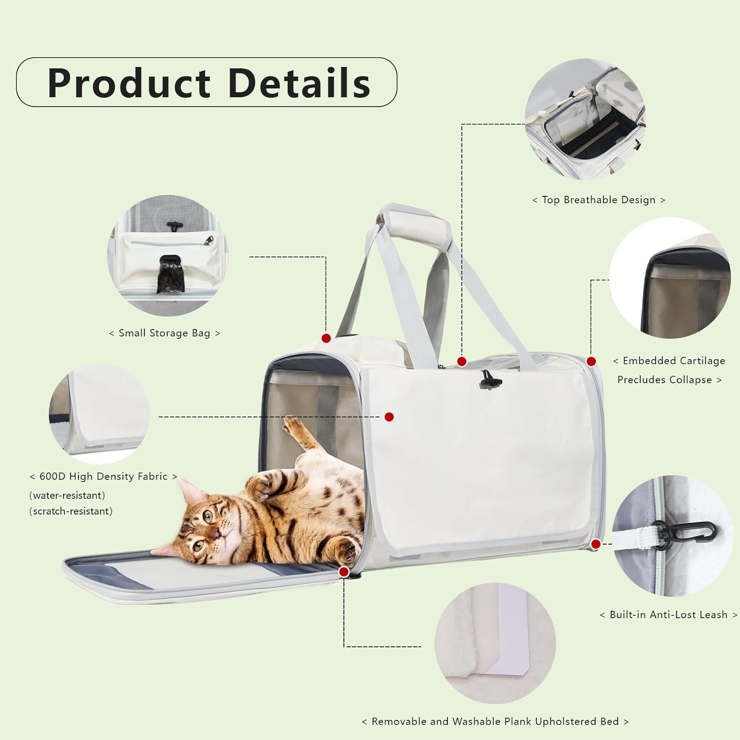 [SAFE DESIGN] – The soft cat travel carrier bag features an upgraded structural design of stainless steel and fiber rod, ensuring that our cat carrier bags for small dogs will not deform or sag, and the top will not collapse, providing preferable stability. It has a built-in adjustable rope buckle for easy locking of the collar. It is collapsible for easy storage.