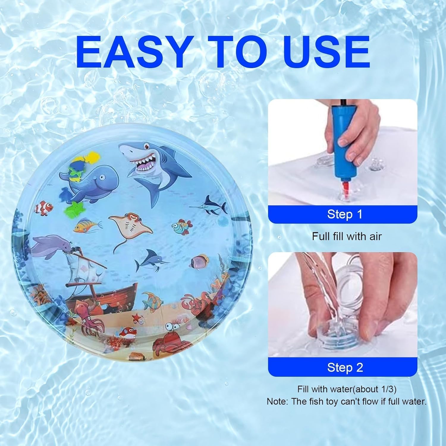 Easy to Use and Portable: Cat water mat with fish foldable design makes it convenient to store and transport, ensuring your pet can enjoy it anywhere, anytime. Setting up thecat water mat with fish is a breeze – simply fill the center with water and inflate the outer ring.