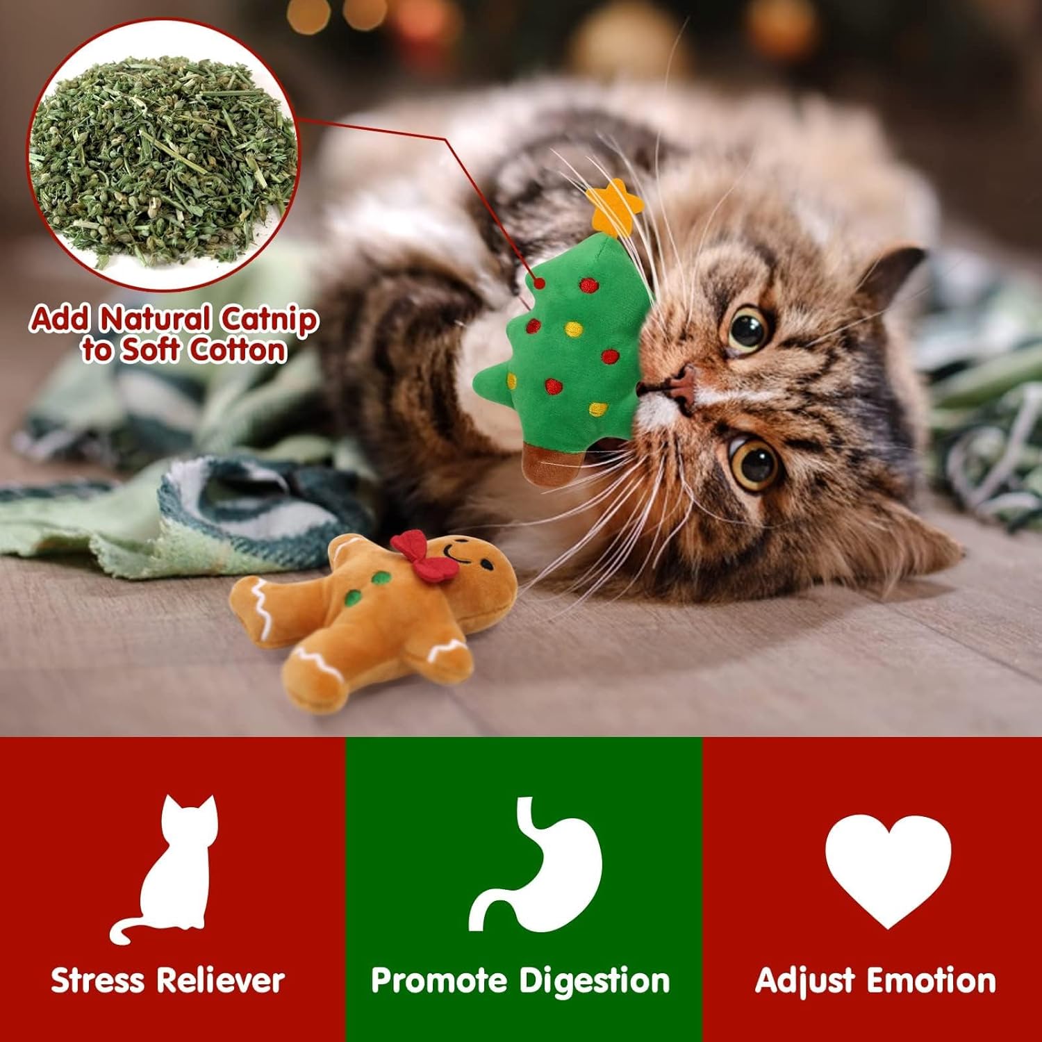 Premium Material & Bite Resistant — Holiday plush cat toys are made of soft flannelette, your cat will really sink their teeth and claws into, machine stitched for ultimate durability, and stuffed with 100% organic enticing catnip to keep your cat’s holiday celebrations furry and bright.