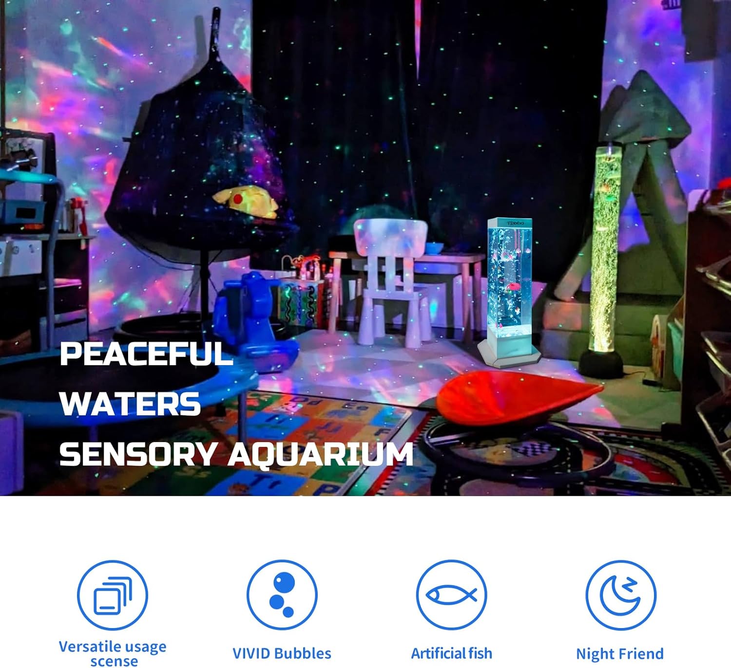 Beneficial for Special Needs Children: For children with special needs, the Serenity Bubble Fish Tank offers a calming and engaging sensory experience. The gentle fish movements, combined with the changing light colors and rhythmic bubbles, create a soothing environment that helps children relax and focus. This product is designed to be both visually stimulating and soothing, making it an essential addition to any therapeutic or sensory room.