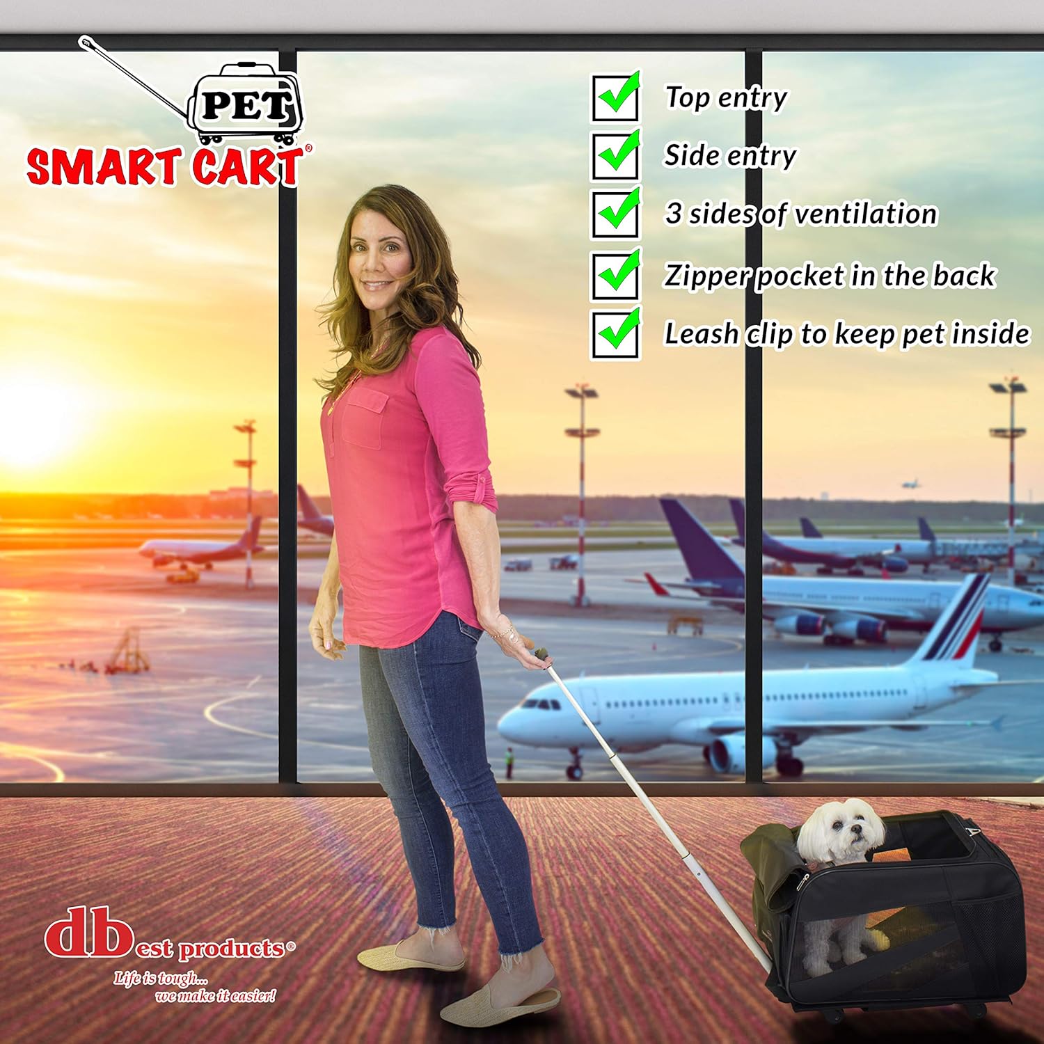 The pet smart cart carrier is an easy collapsible rolling cart that folds to less than 4 inch for easy storage. It fits airline safety and size requirements. The Pet Smart Cart Carrier has a removable padded comfort bedding and collar clip as well as a padded and adjustable shoulder strap. Contains large zipper pockets for treats, dog bags etc. It is designed with 3 sides of ventilation including the back door. The back opens wide for ease-of-access. It is made with durable, flexible water proof material.