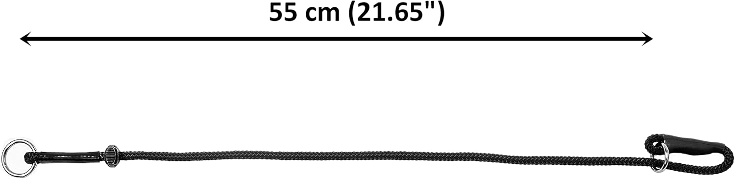 Black choke collar made of strong cord with 1 movable plastic limiter and chromed semi-circle. The slip collar can be used everyday under the supervision and after a consultation of a professional dog trainer