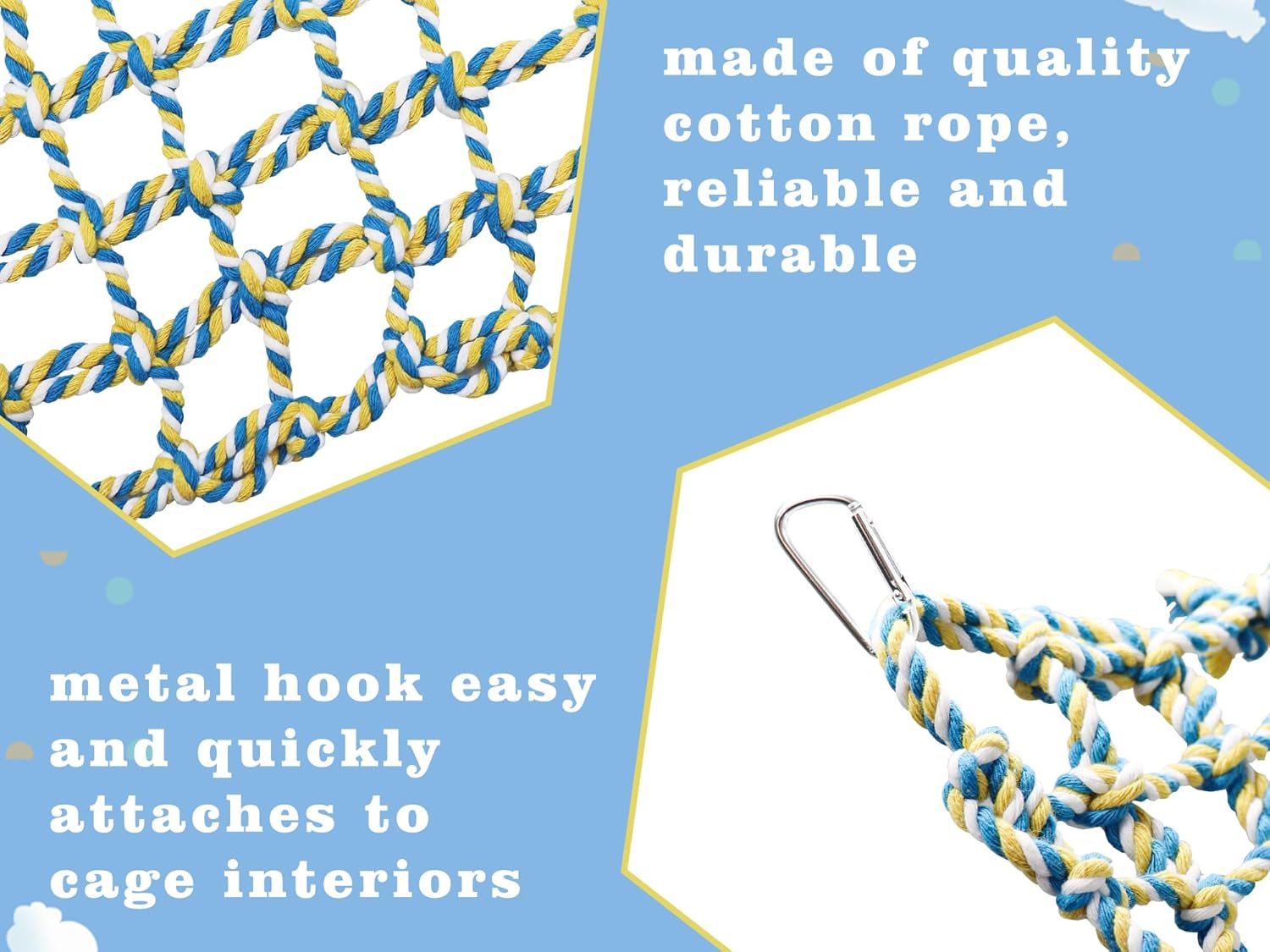Small Animal Climbing Toys: The small animal cotton rope net package contains stainless steel hooks, you can directly hang the cotton rope net on the pet’s cage at any angle or way you want, providing your pet with a fun climbing and play space.