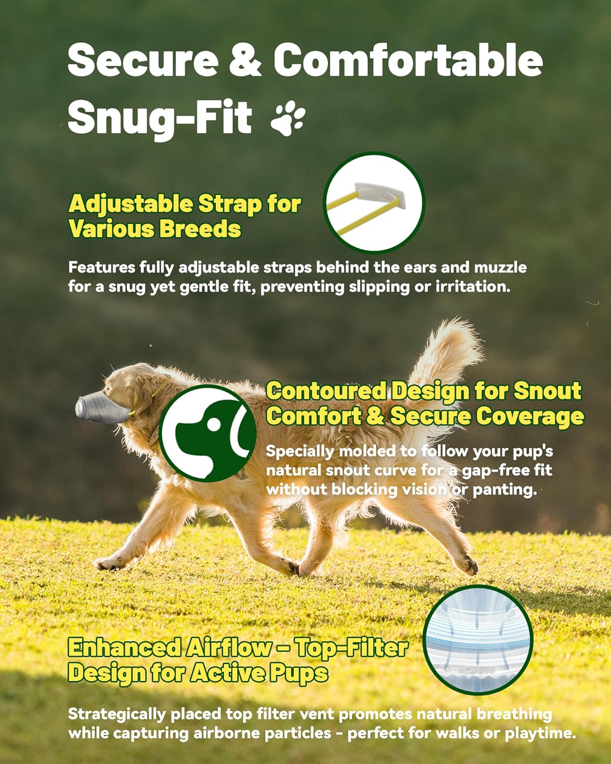 Ergonomic Snout Shape – Gap-Free Comfort: Top filter opening enhances breathability, allowing natural airflow while minimizing the intake of airborne particles. Great for active pups.