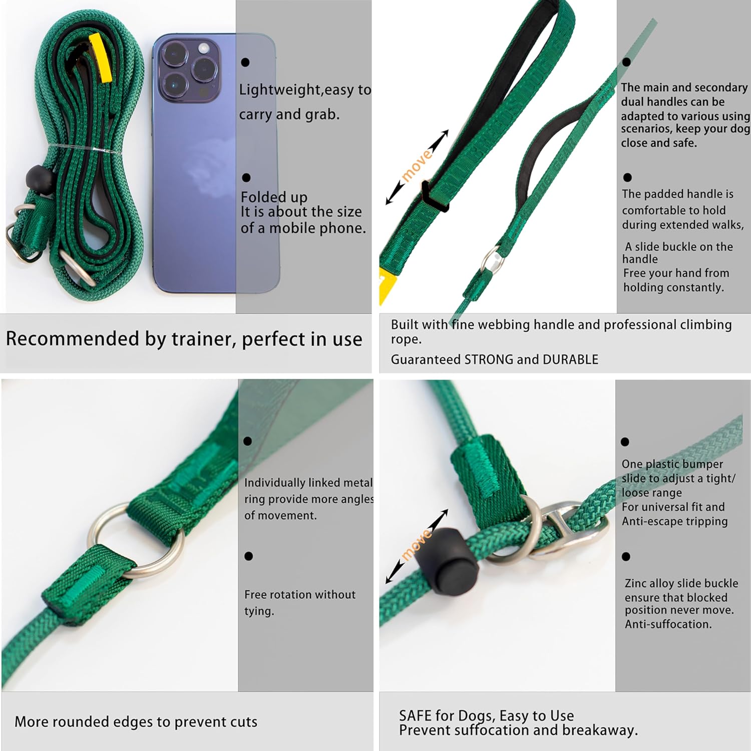 【Guaranteed Heavy Duty and DURABLE】Built with heavy-duty thick cord, the rest part of its main body takes strong&supple webbing, ever worry about broken and twisted damage. Overall, the Fine Webbing TRAINING LEASH serves as an essential tool for dog owners who prioritize safety, control, and effective training methods. Its durable construction combined with adjustable features make it suitable for different breeds and sizes of dogs. Whether you are teaching basic commands or working on advanced obedience skills, this leash proves to be a reliable companion throughout your dog’s training journey.