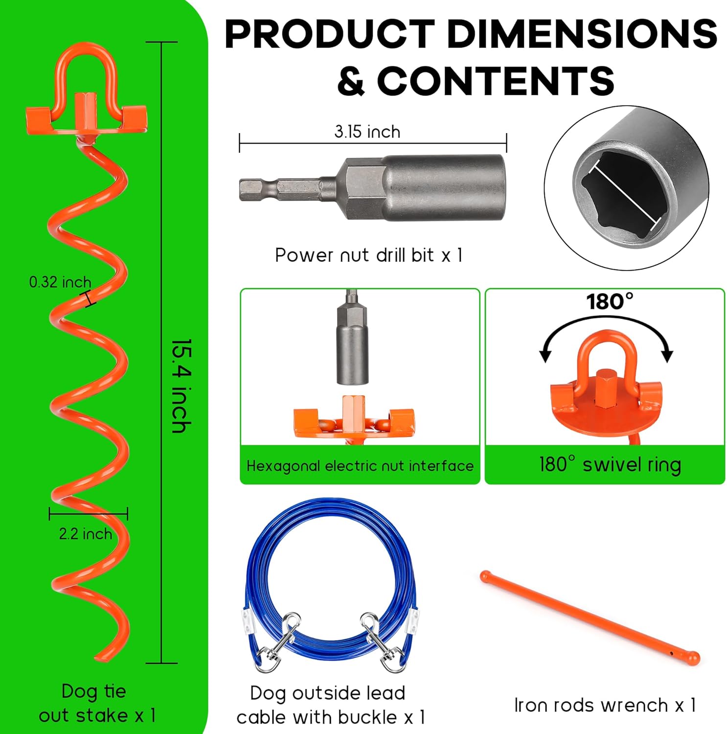 【Great Value Set】 Dog tie out stake x 1, power nut drill bit x 1, iron rods wrench x 1, dog outside lead cable with buckle x 1; All the necessary installation accessories are included, so you won’t need to buy anything extra. The setup is quick and straightforward, making it easy to save time and effort