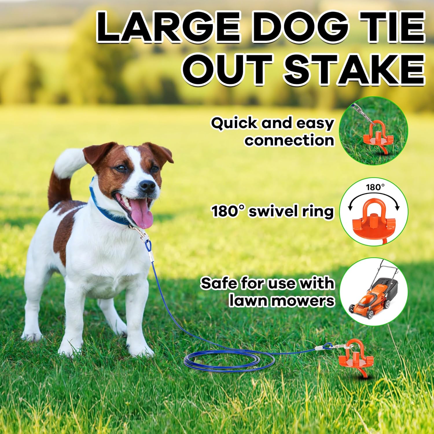 【360° Swivel & Tangle-Free】Keep your dog safe and happy with this 14-inch heavy-duty tie-out stake. It features a round top plate with a welded 180° flip ring and a tangle-free cable equipped with a 360° rotating lock for maximum freedom and security. It allows your dog to roam freely without getting tangled or restricted, giving your furry friend a safer and more enjoyable outdoor experience. Perfect for use in the yard, at the park, on the beach, or during picnics, hikes, and camping trips