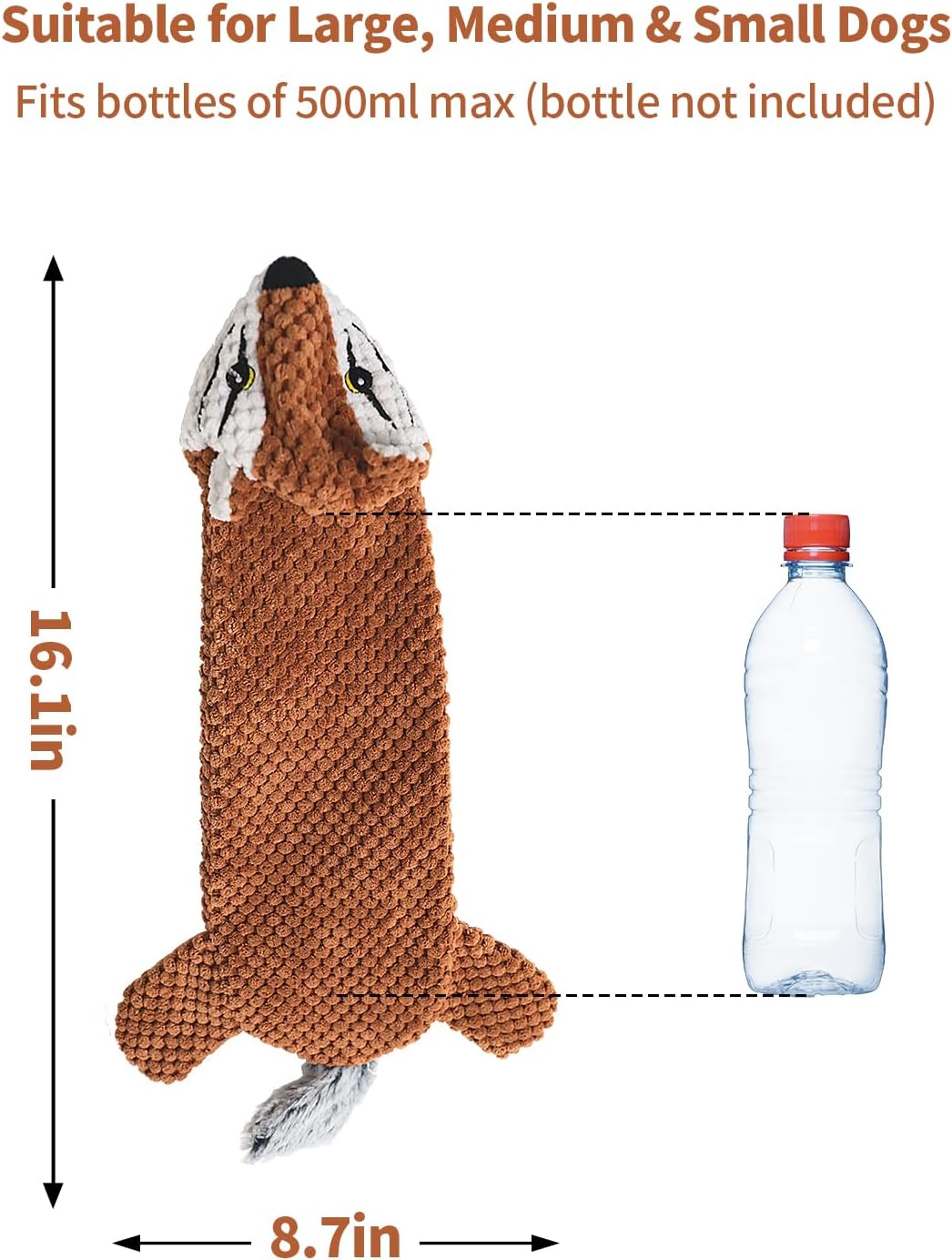 2 IN 1 Dog Toy with Crunchy Bottle & Crinkle Paper: We studied the dog toys on the market and created the unique squeak toy that combines crinkle paper and crunching plastic bottle. Since dogs have the natural chewing trait of liking to chew on bottles, this toy is more appealing to the dog’s desire to chew and curiosity to play. The toy allows plastic water bottles to be reused, contributing to environmental protection and ecological sustainability.