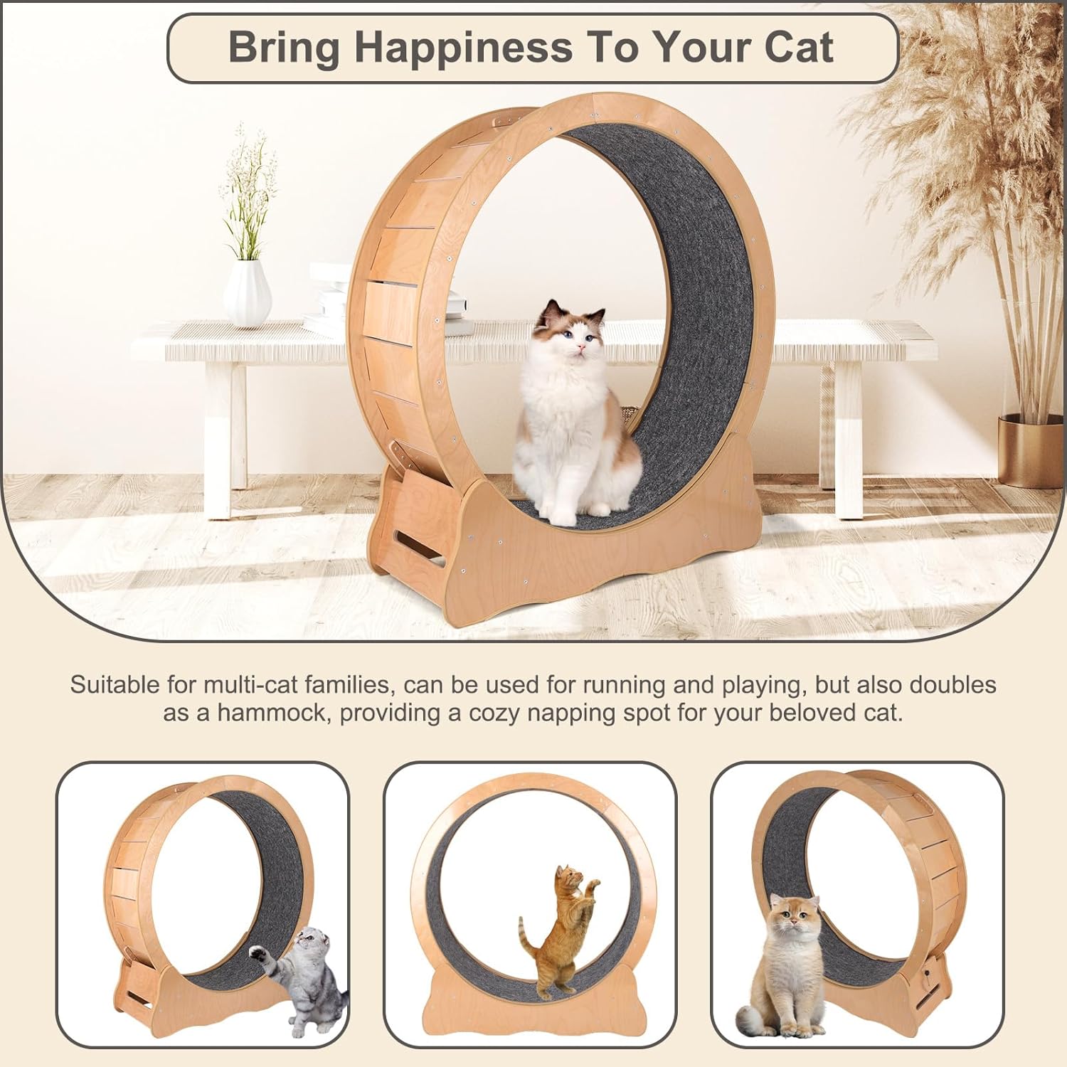 Large Diameter: With an external diameter of 43.3 in and an internal diameter of 39.33 in, the wheel width is 11 in, enhanced base is wide and solid enough to supporting cats >16.5lb. Most pets stay indoors and lack exercise, this cat wheel allows your cats to stretch, play freely and lose weight