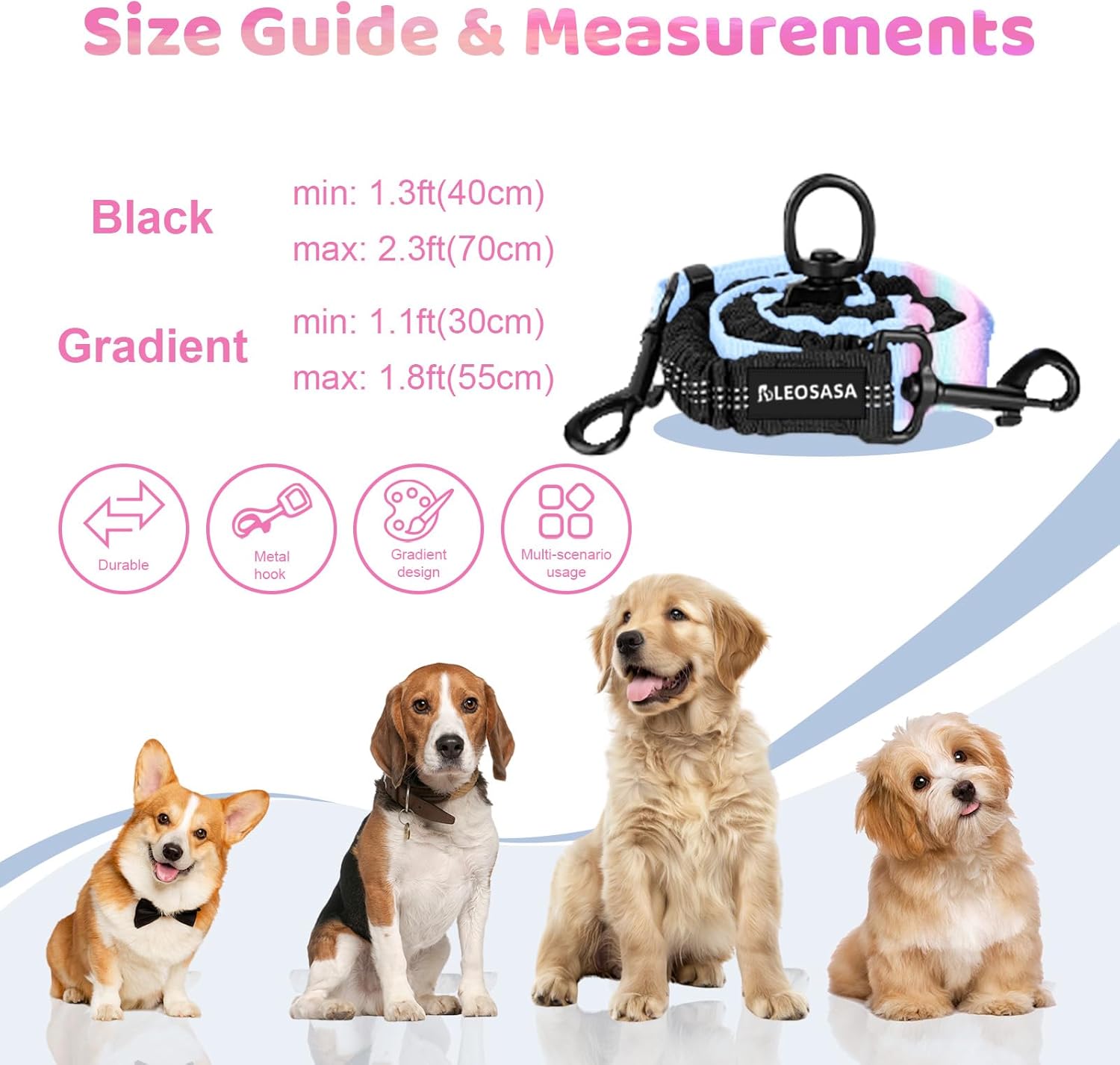 Effortless Dual-Dog Walks, Now with Stylish Gradient! Upgrade your walks with LEOSASA’s dual leash set —featuring a classic black leash (1.3-2.3ft) for large dogs and an adjustable gradient leash (1.2-1.8ft) for small/medium pups. Designed for tangle-free control: ✅ 360° Swivel Clip – Rust-proof zinc alloy clip prevents twisting. ✅ Shock-Absorbing Bungee – Reduces pulls for comfy walks. ✅ Car Seatbelt Mode – Keeps dogs secure during drives. ✅ Reflective Strips – Safer for night walks. Ideal for multi-dog homes, travel, or energetic pups!