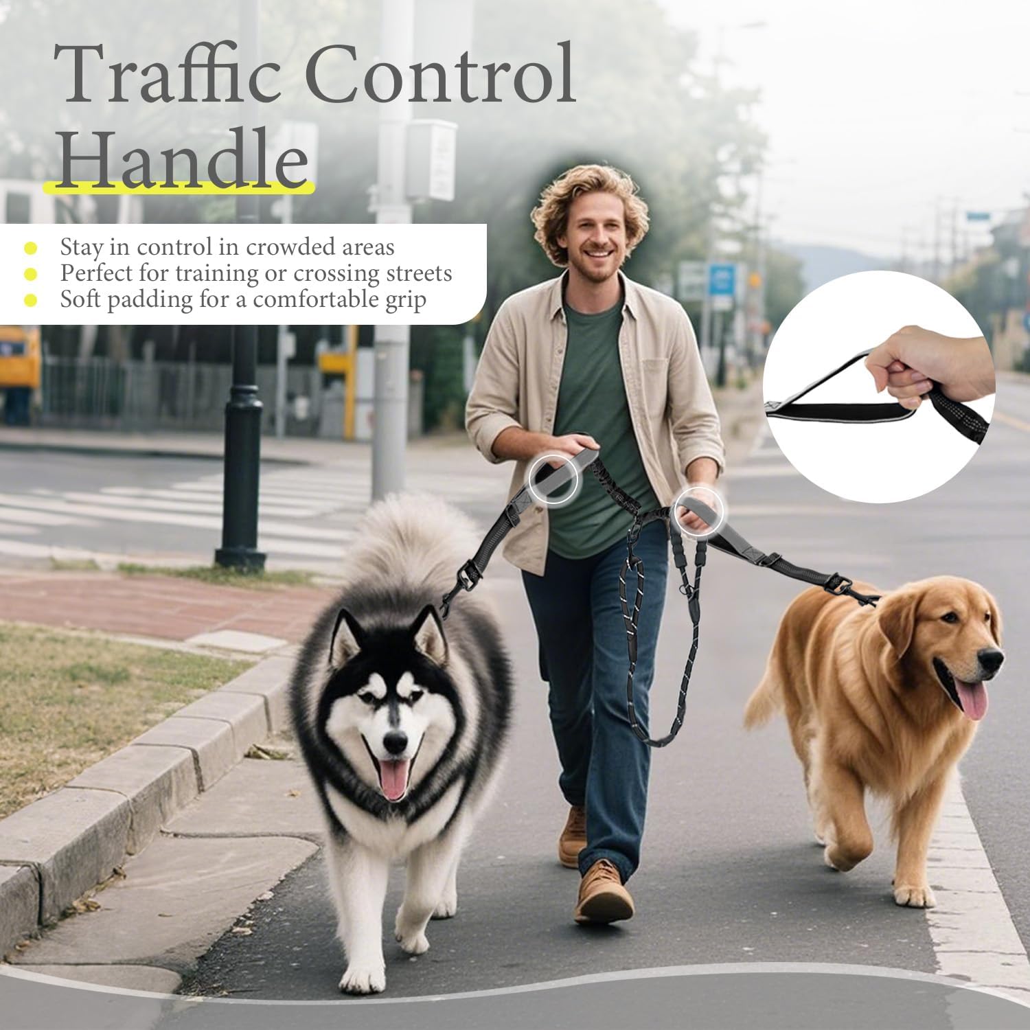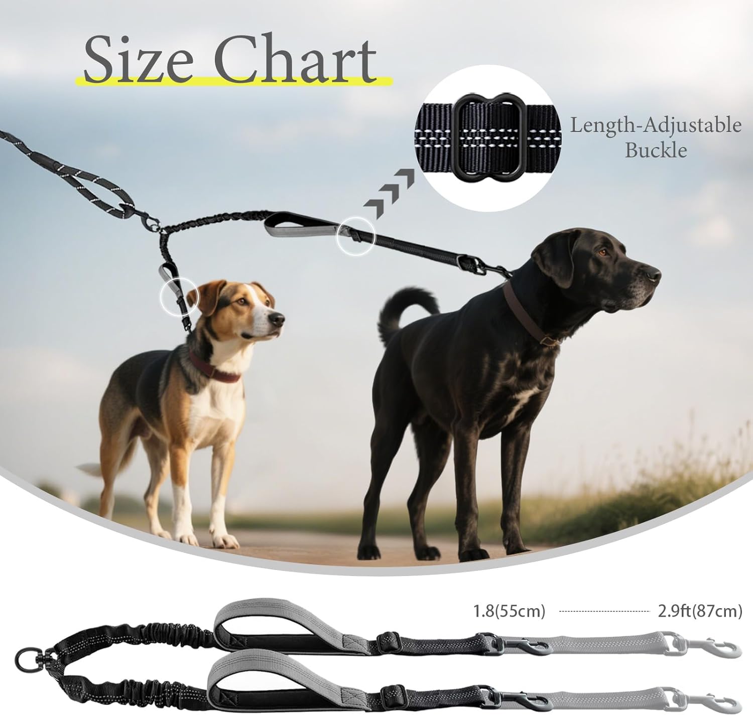 【Adjustable Buckle & Extensible Rope for Multi-Use】 – Size of the Coupler: <2.1-3.1 ft > / <25.6-27.4 in> / <65-95 cm>. Each rope is equipped with an Adjustable Buckle, so you can freely adjust the length when training, walking, running, or hiking with your furry friends. The Retractable Shock-Absorbing leash effectively reduces strain on your arms and shoulders when your dog suddenly lunges or changes direction, ensuring a more comfortable experience for both the dog and the walker.