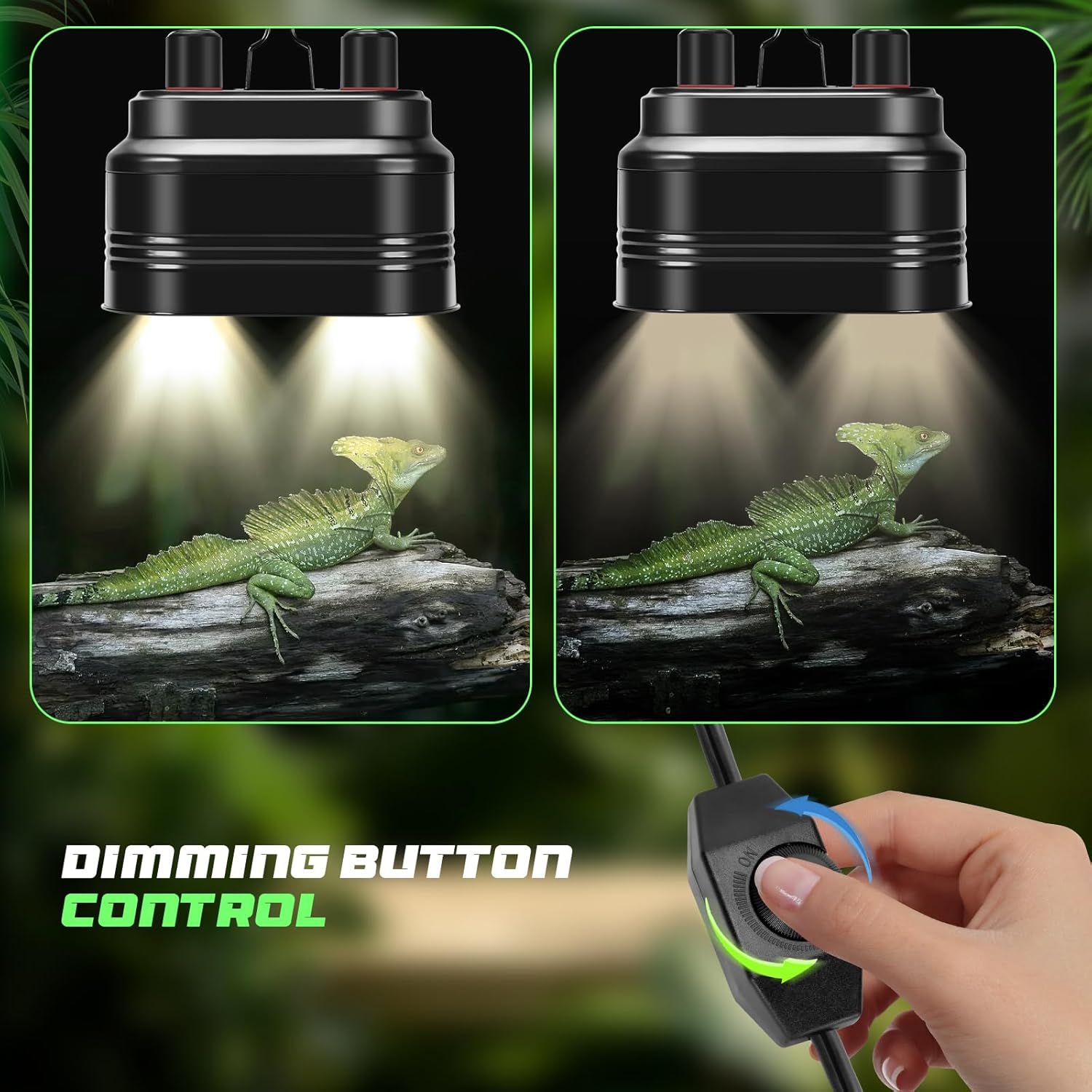Suitable for Most Bulbs: The reptile lighting fixture with dimming is equipped with an E26 heat-resistant ceramic lamp holder and an integrated double lamp head design, which can be used with most bulbs used for reptiles, such as UVA, UVB, reptile ceramic heating lamps, and basking lamps, heating lamps, fluorescent lamps, luminous lamps, energy-saving lamps, infrared spotlights, etc. (Max 100W).