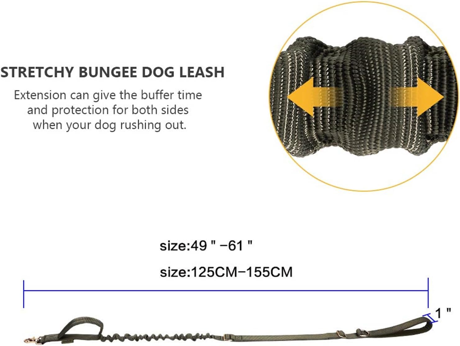 Flexible Length. This bungee leash for dog has a good elasticity provides sufficient stretching force, and has an extension can give the buffer time and protection for both sides when your dog rushing out,Length 49-61 inches.