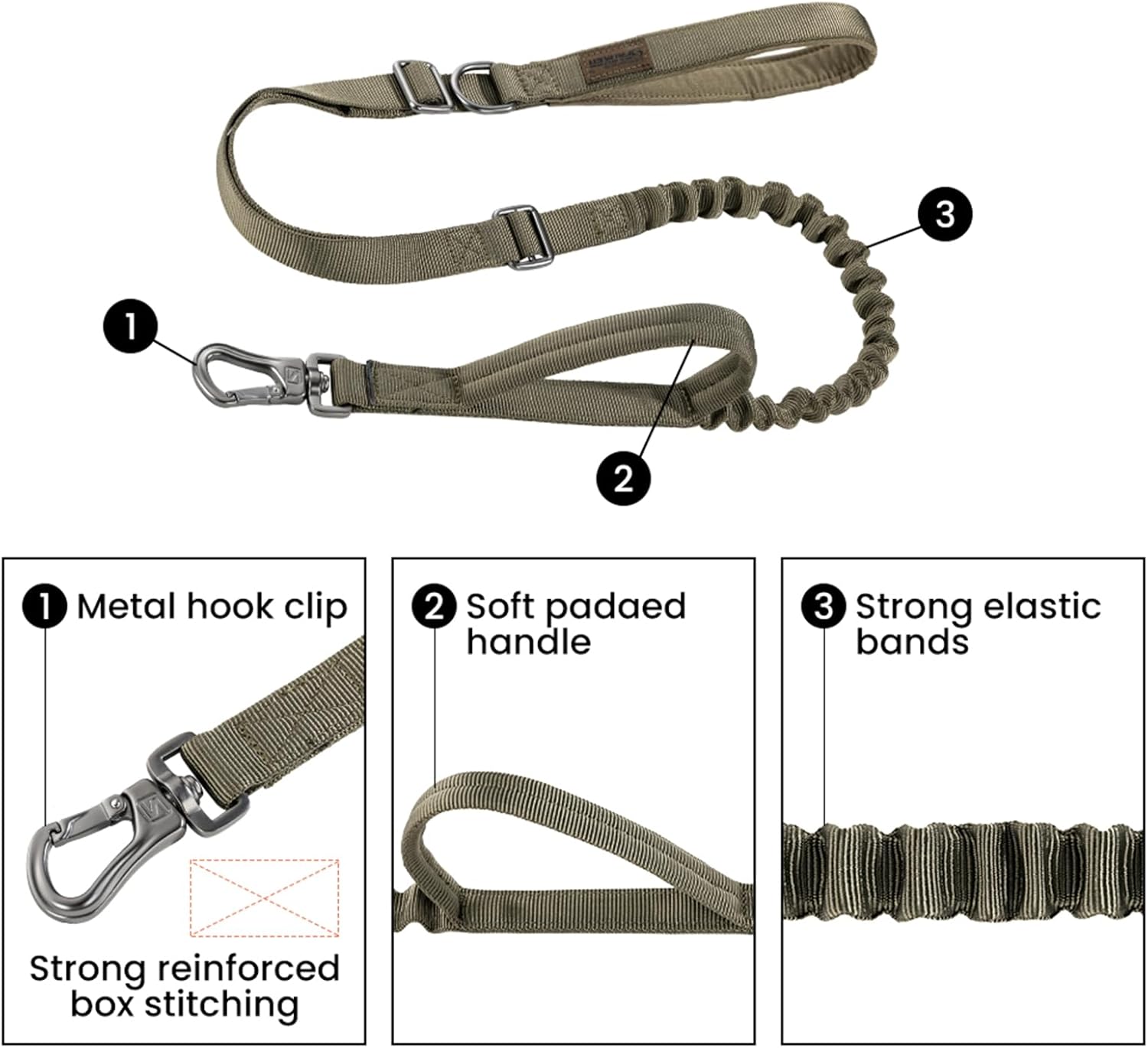 EXCELLENT ELITE SPANKER Tactical Dog Leash Heavy Duty 5-6FT Adjustable No Pull Military Bungee Dog Leash Elastic Leads Rope with 2 Padded Control Handle for Medium Large X-Large Dogs(Ranger Green)